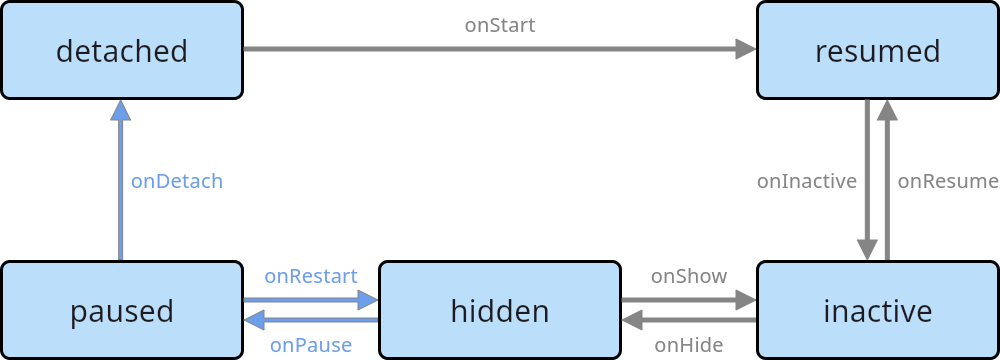 앱을 비활성 상태(예: 백그라운드로 전환)/활성 상태로 변경 시 감지할 수 있다. 본래 Android, IOS OS의 각 생명주기의 형태가 다르지만 flutter는 이를 추상화하여 총 5단계로서 제공한다.