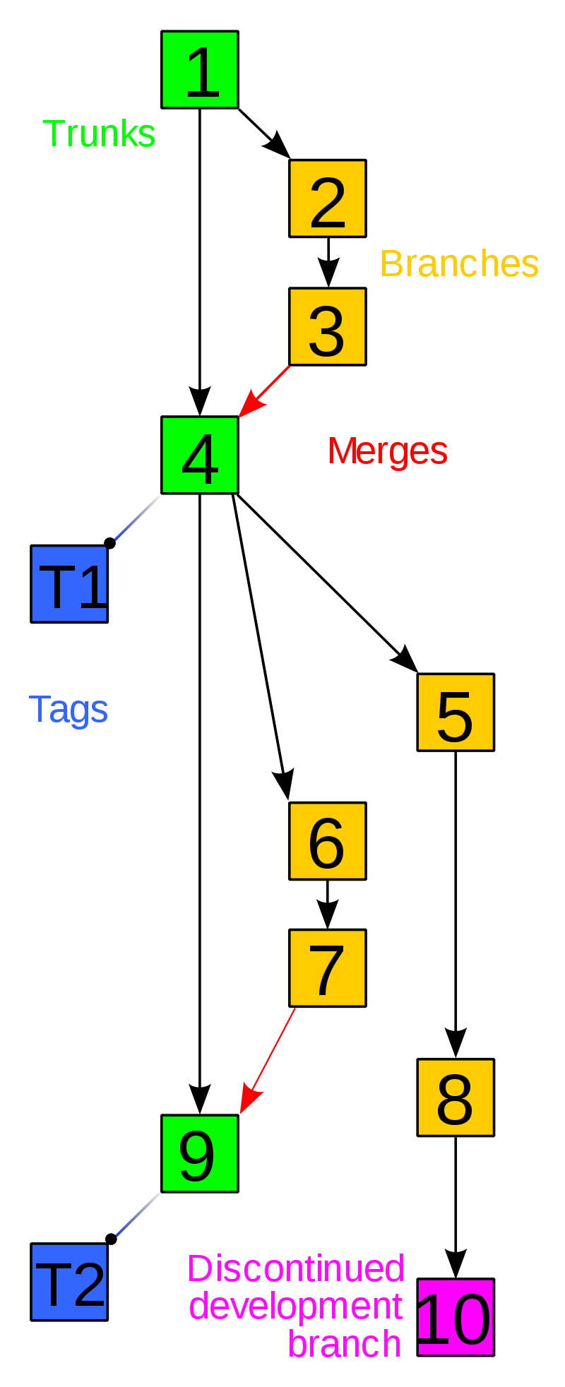 수정은 일반적으로 일련의 개발과정에서 발생하며, 각각의 분기점에서 뻗어나가, 새로운 기능을 추가한다. 이때 분기점(Branches)에서 기존 계획에 필요하거나 추가해야할 기능이라면, 더해지지만(merges) 그렇지 않은 경우 사라진다.