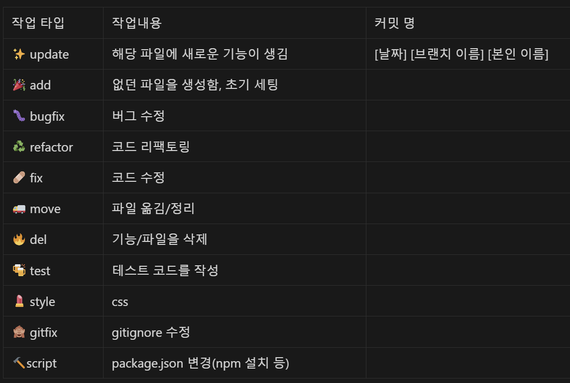 git commit -m "날짜 / 브랜치 이름 / 본인 이름 : 작업내용"