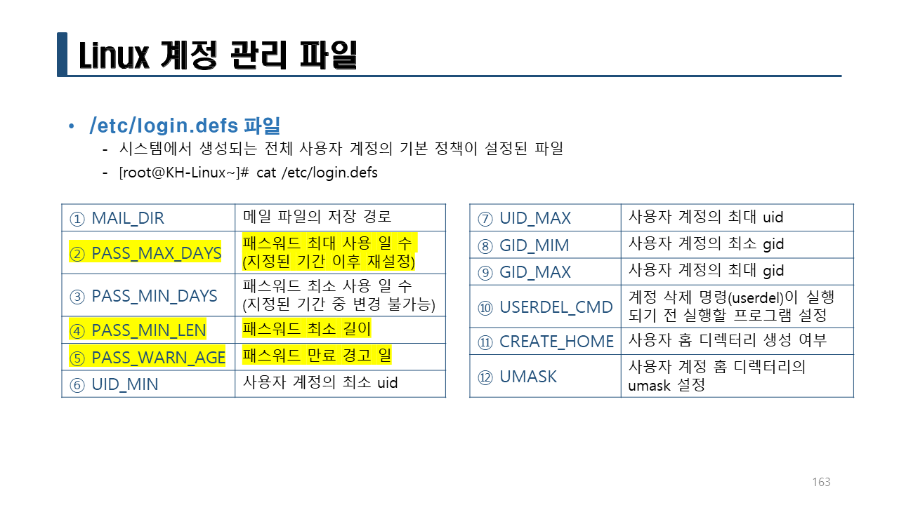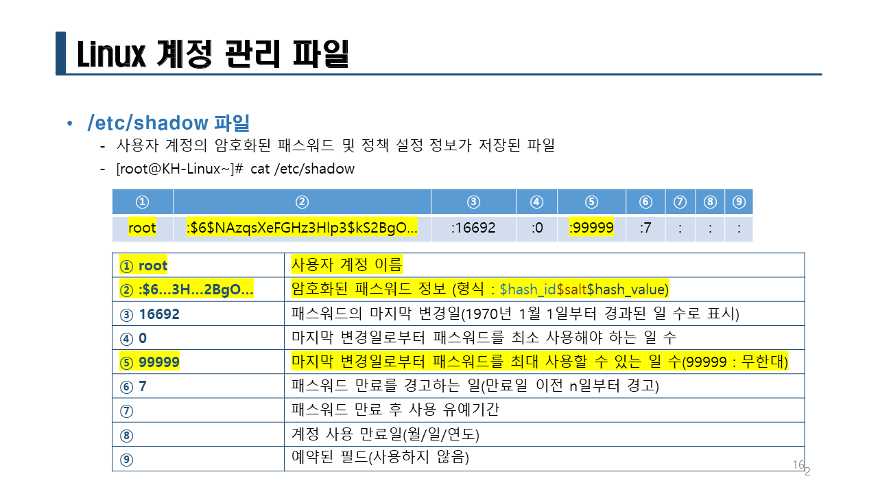 -/etc/shadow 파일에 비밀번호 필드에 !! 를 추가한다.
