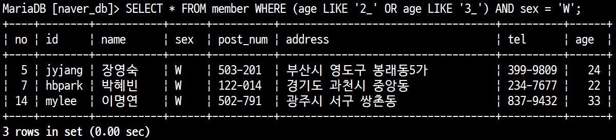 sqlite> SELECT * FROM member WHERE no=1 OR no=3;