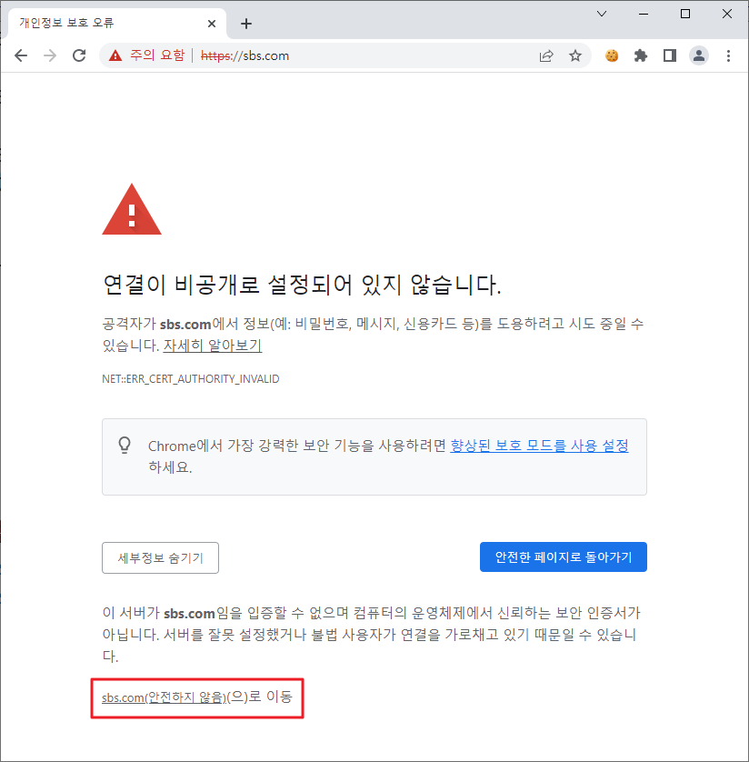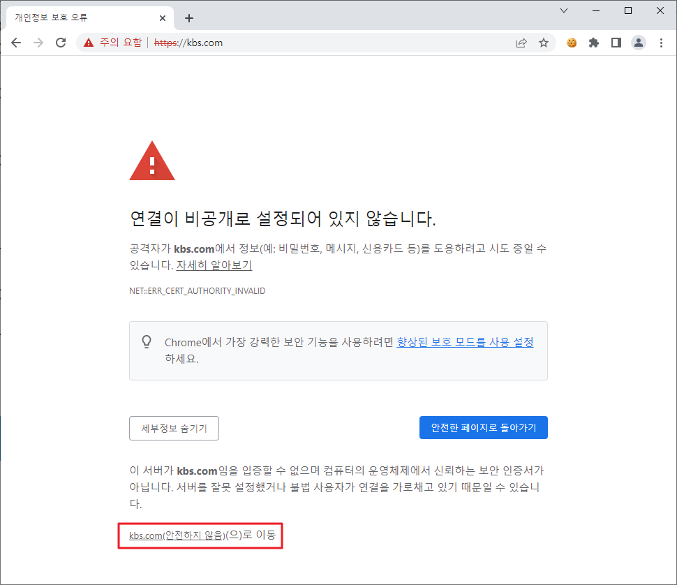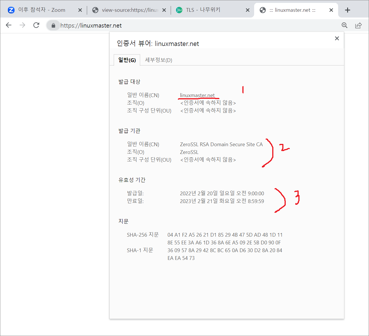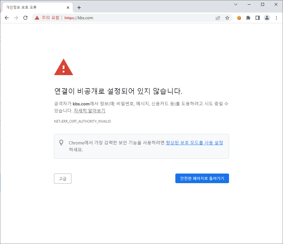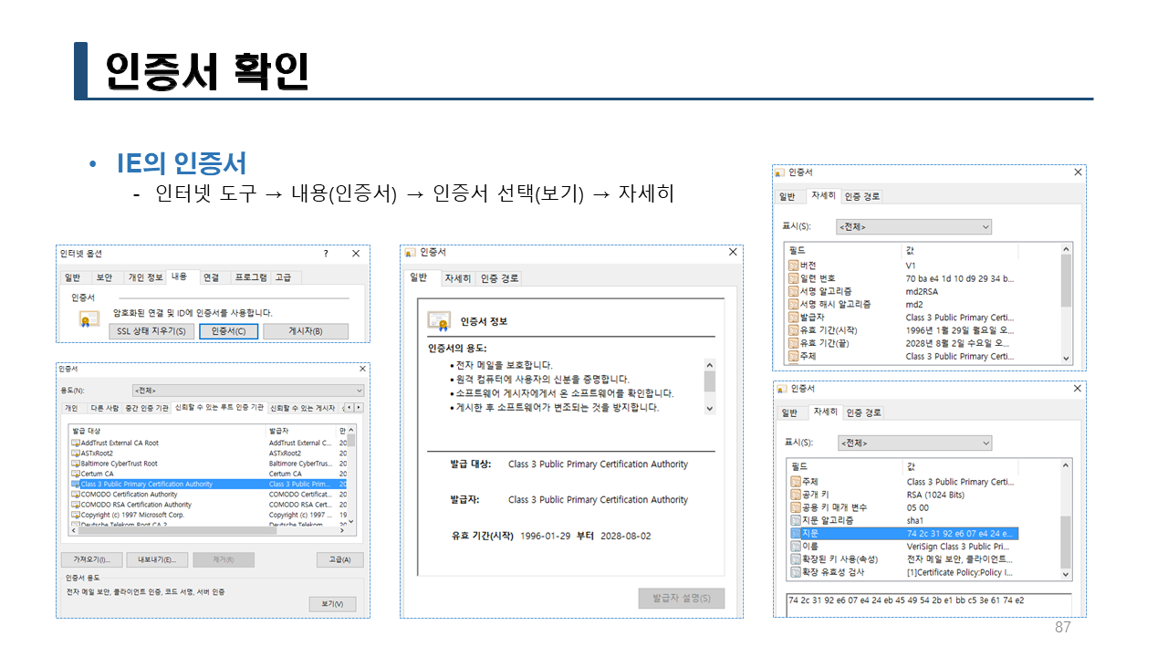 중간 인증 기관, 신뢰된 루트 인증 기관을 확인한다.