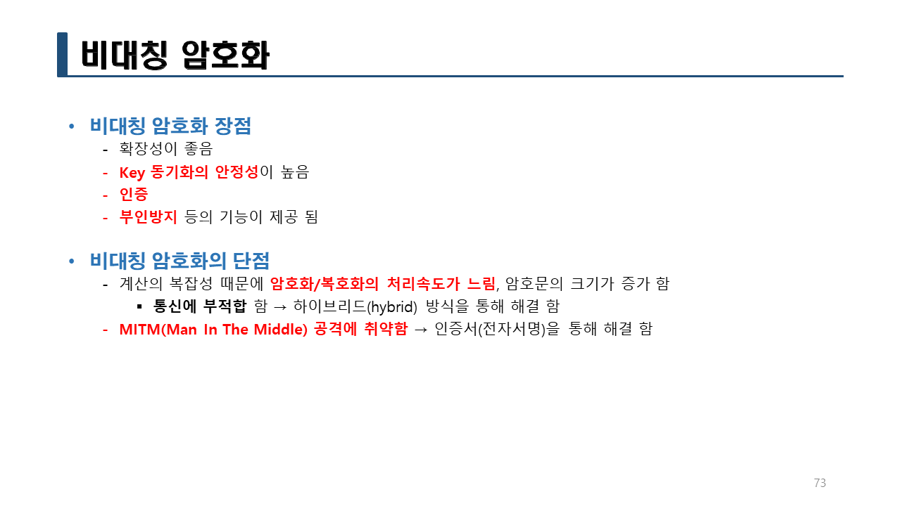 예를 들어서 10,000명과 통신하기 위해서는 10,000개의 키가 필요하고 10,000개의 키를 관리, 운영, 보관해야 하므로 Key 관리에 어려움이 있다.