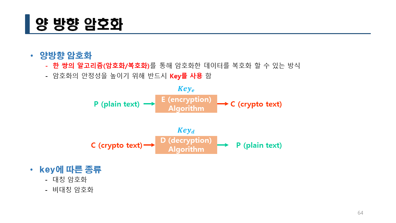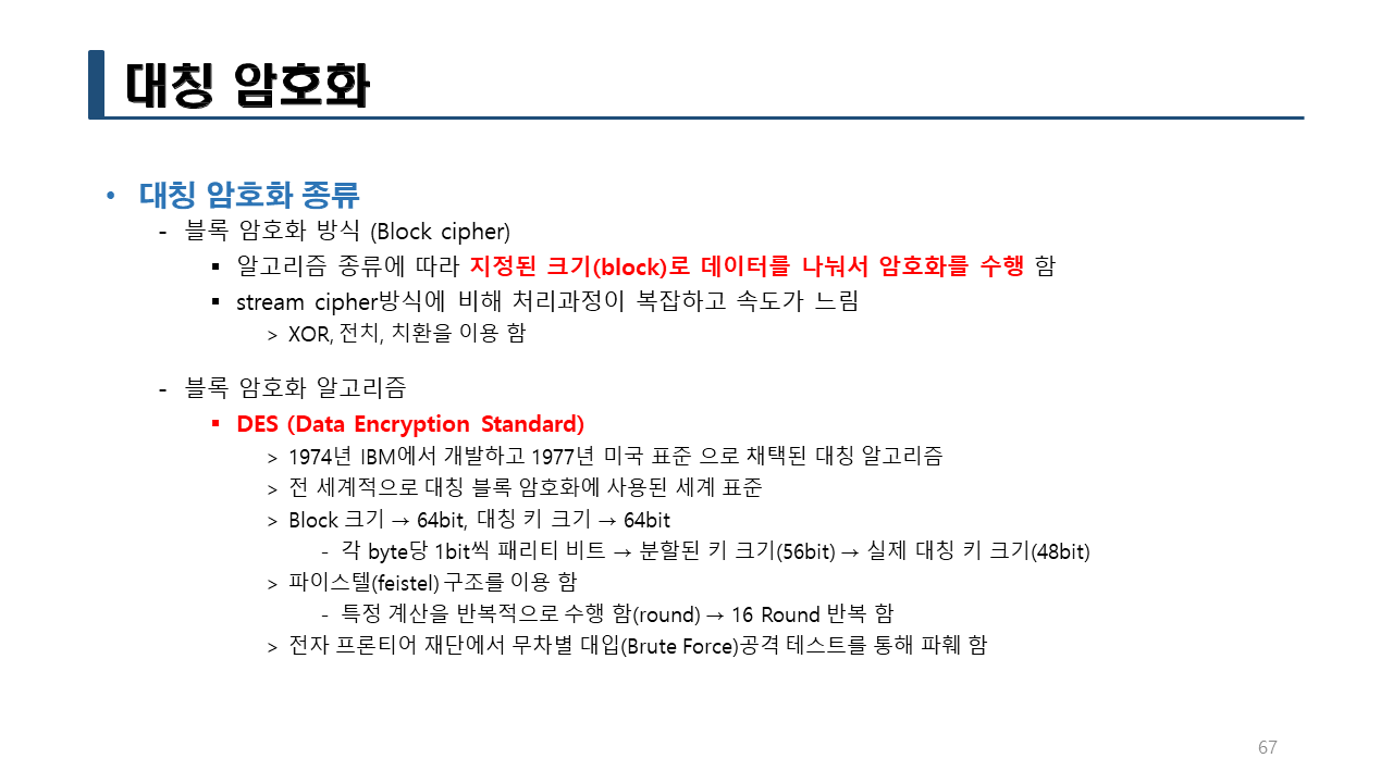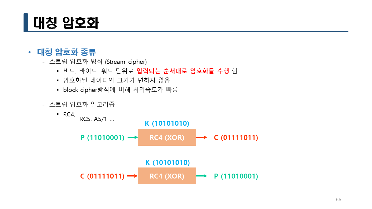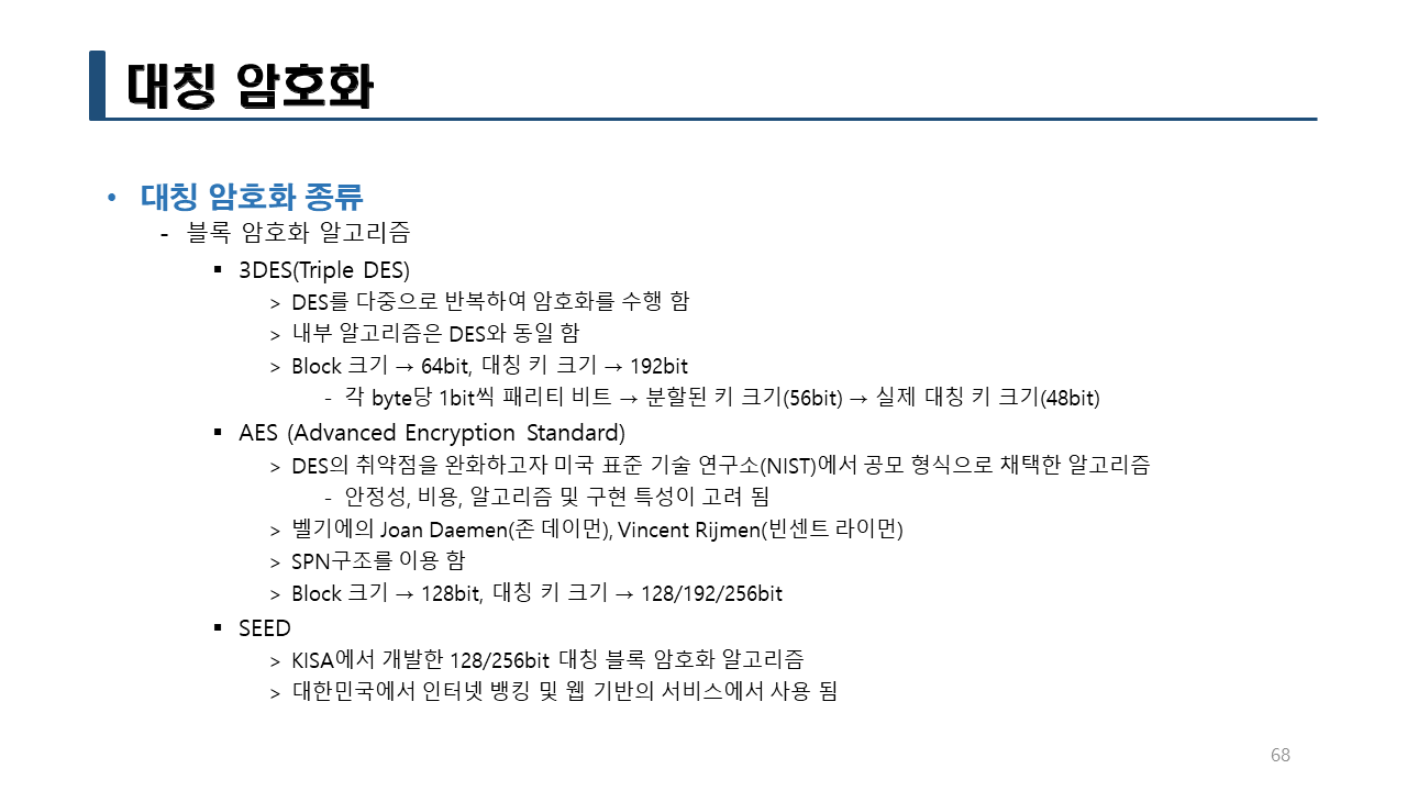 -암호화 및 복호화에 동일한 키를 사용하는 암호화 기법 (암호화키 == 복호화키)