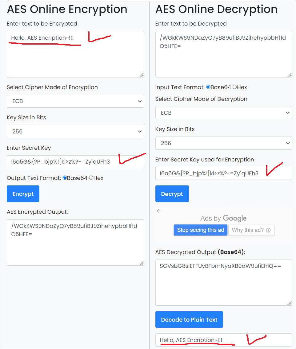 실습> AES 암호화/복호화 온라인으로 사용하기