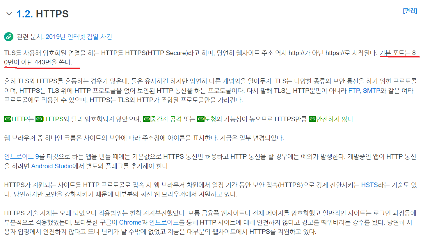 https: 암호화 통신, 인증서, 443번 포트, 자가인증(인증서 오류), 신뢰된 인증기관에서의 인증(오류가 안나지만 비용이 발생한다.)