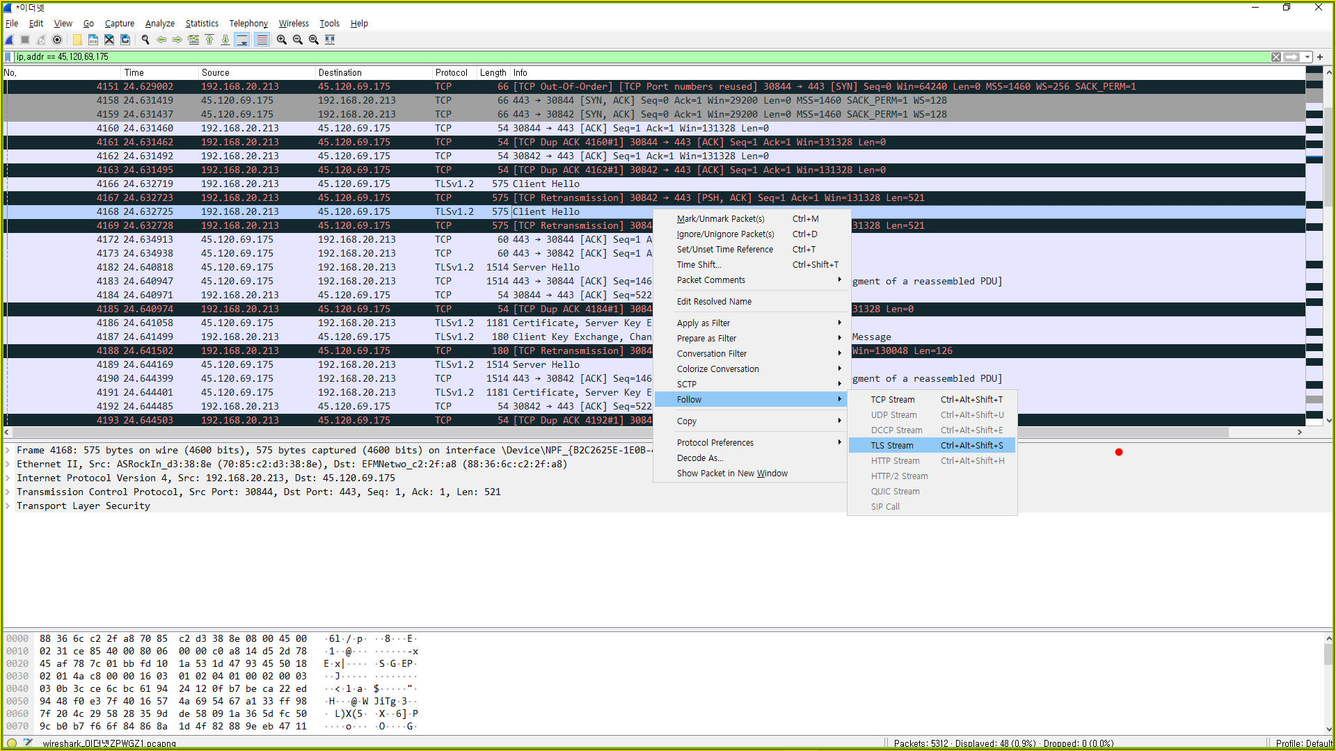 ip.addr == 45.120.69.175 <-- 45.120.69.175 만 확인한다는 의미이다.
