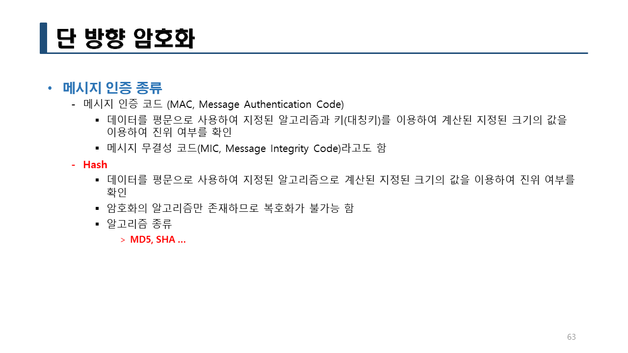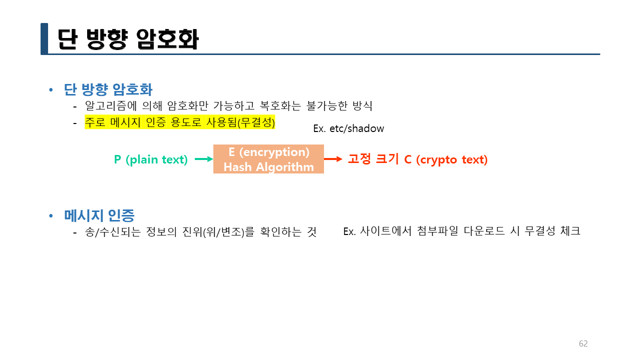 Hash는 주로 무결성을 체크할 때 사용한다. (/etc/shadow 비밀번호)