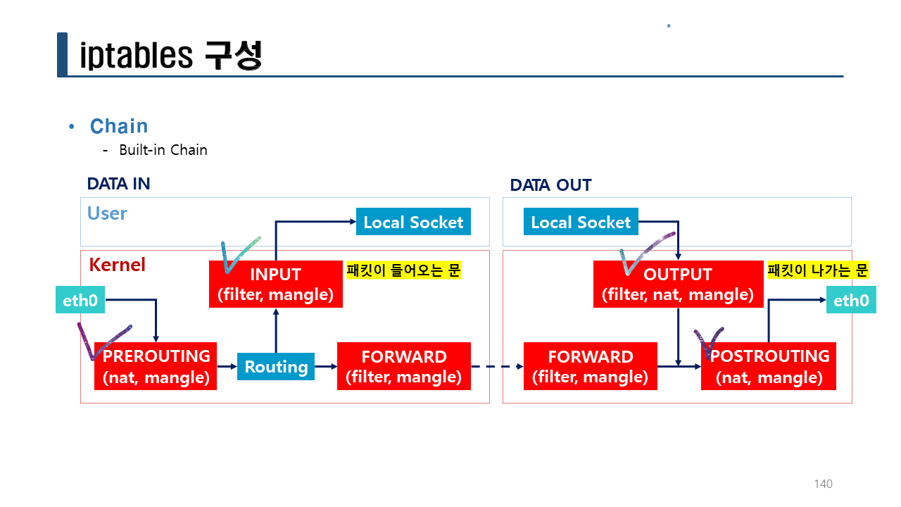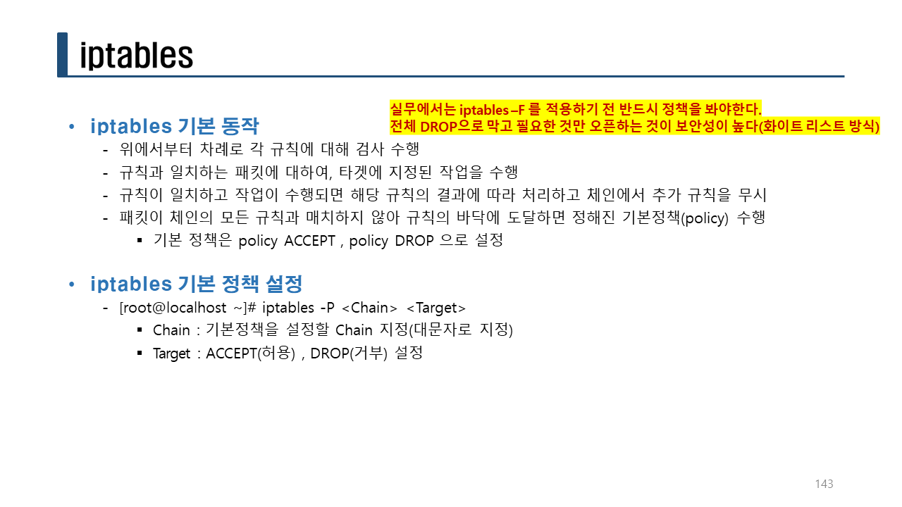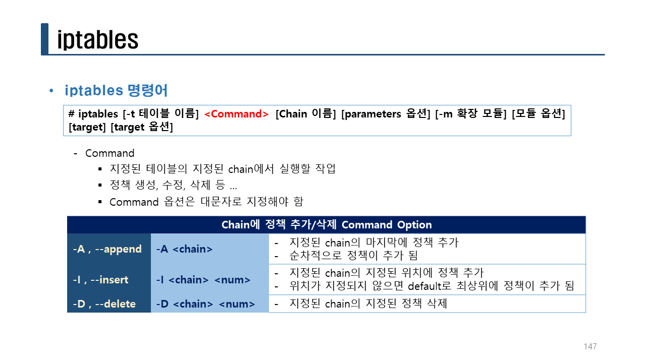 iptables [-t 테이블명] -D 체인명 룰번호 [옵션]