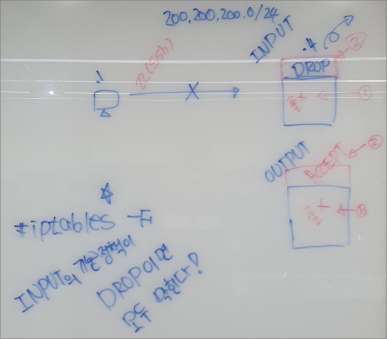 -아무 룰도 없는 상태에서 기본 정책을 DROP으로 변경하면 클라이언트와 연결된 세션은 끊어진다.