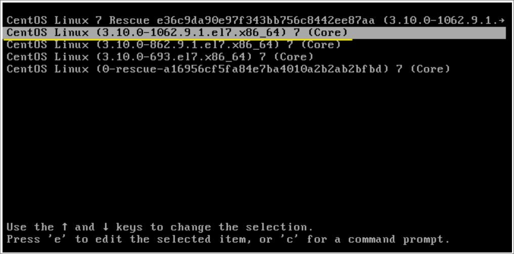 CentOS7 부팅 시 키보드 키 ESC 키를 누르면 아래처럼 GRUB 화면이 나온다. 이때 키보드 e 키를 누르면 GRUB 편집 모드로 바뀐다.