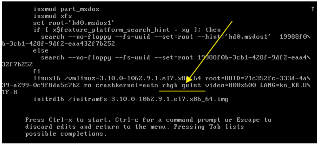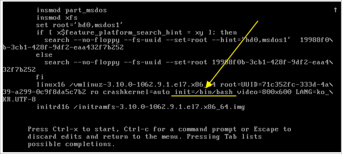 GRUB 편집모드로 들어와서 커서를 kernel 부분에 위치하고 rhgb quite 를 삭제하고, 아래처럼 init=/bin/bash 로 수정한다.