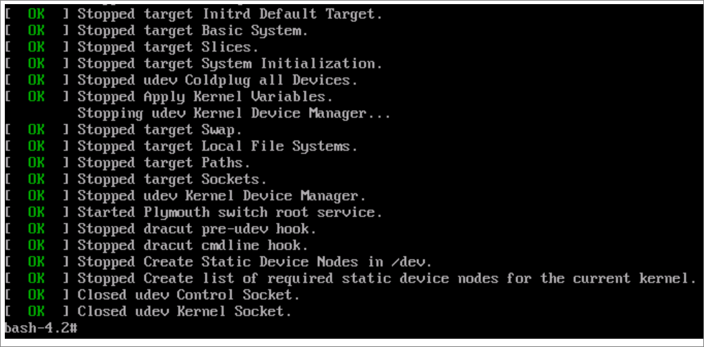 부팅이 완료되면 root 권한의 쉘 (bash-4.2#) 이 떨어진다.