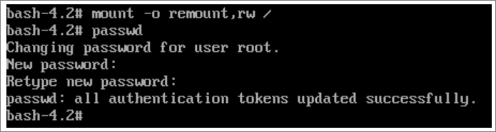 mount -o remount,rw / 명령어로 /파일시스템을 rw모드로 변경하고 passwd 명령어로 root(관리자) 비밀번호를 변경한다.