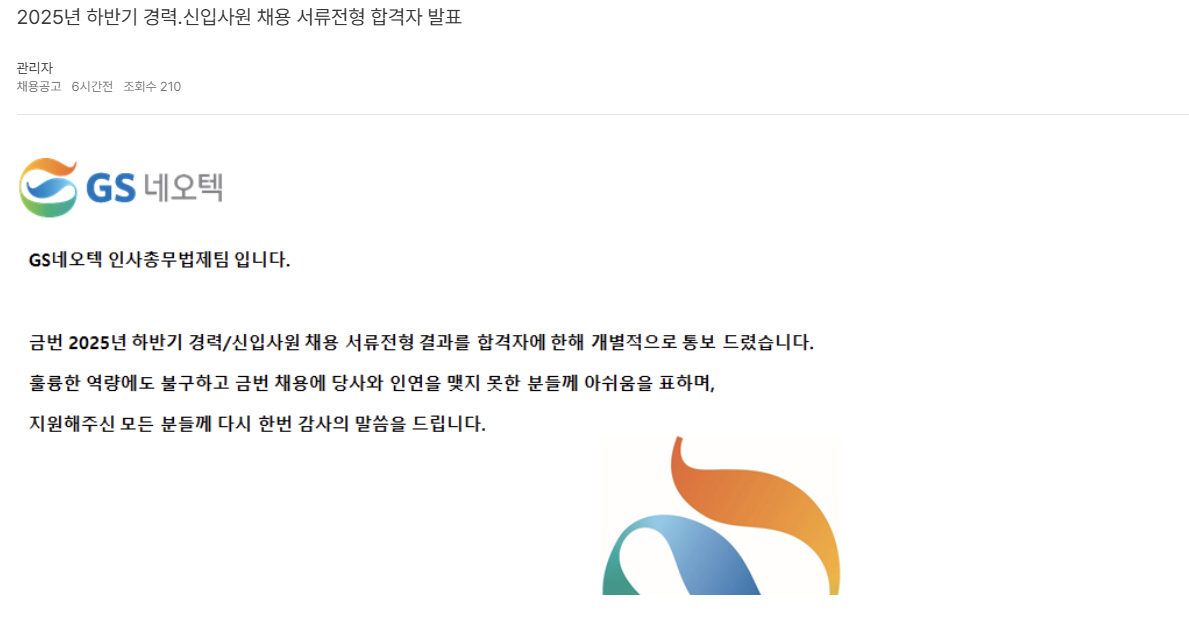 하반기 공채가 가장 먼저 뜬 현대로템이 아직도 서류 결과가 안나와서 당연히 GS네오텍도 안나온 줄 알았는데 우연히 본 자소설닷컴의 채팅방에서 이미 결과가 남을 9월 23일에 확인하였다.