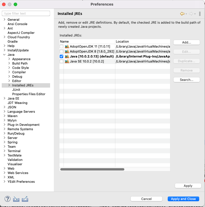 Java > Installed JREs