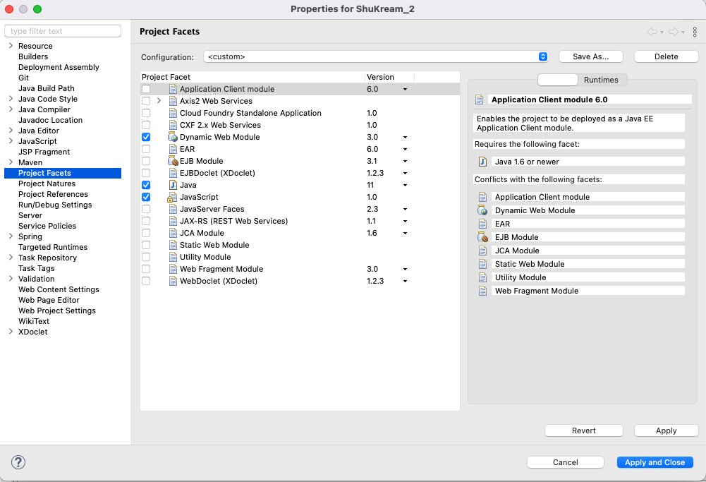 Project Facets의 Java 버전도 잘 설정되어 있다.