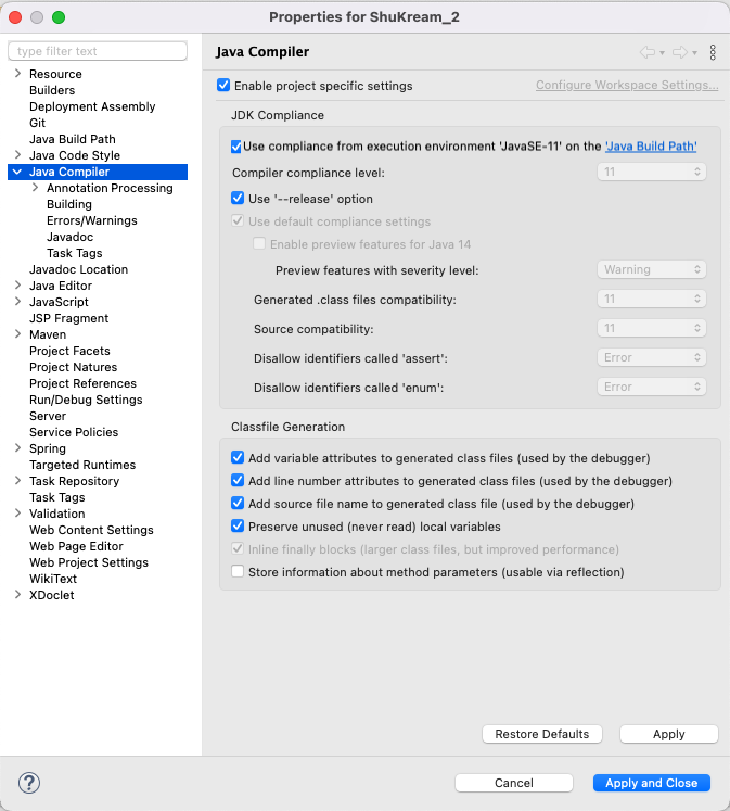 우선 프로젝트 우클릭 > properties > Java Compiler
