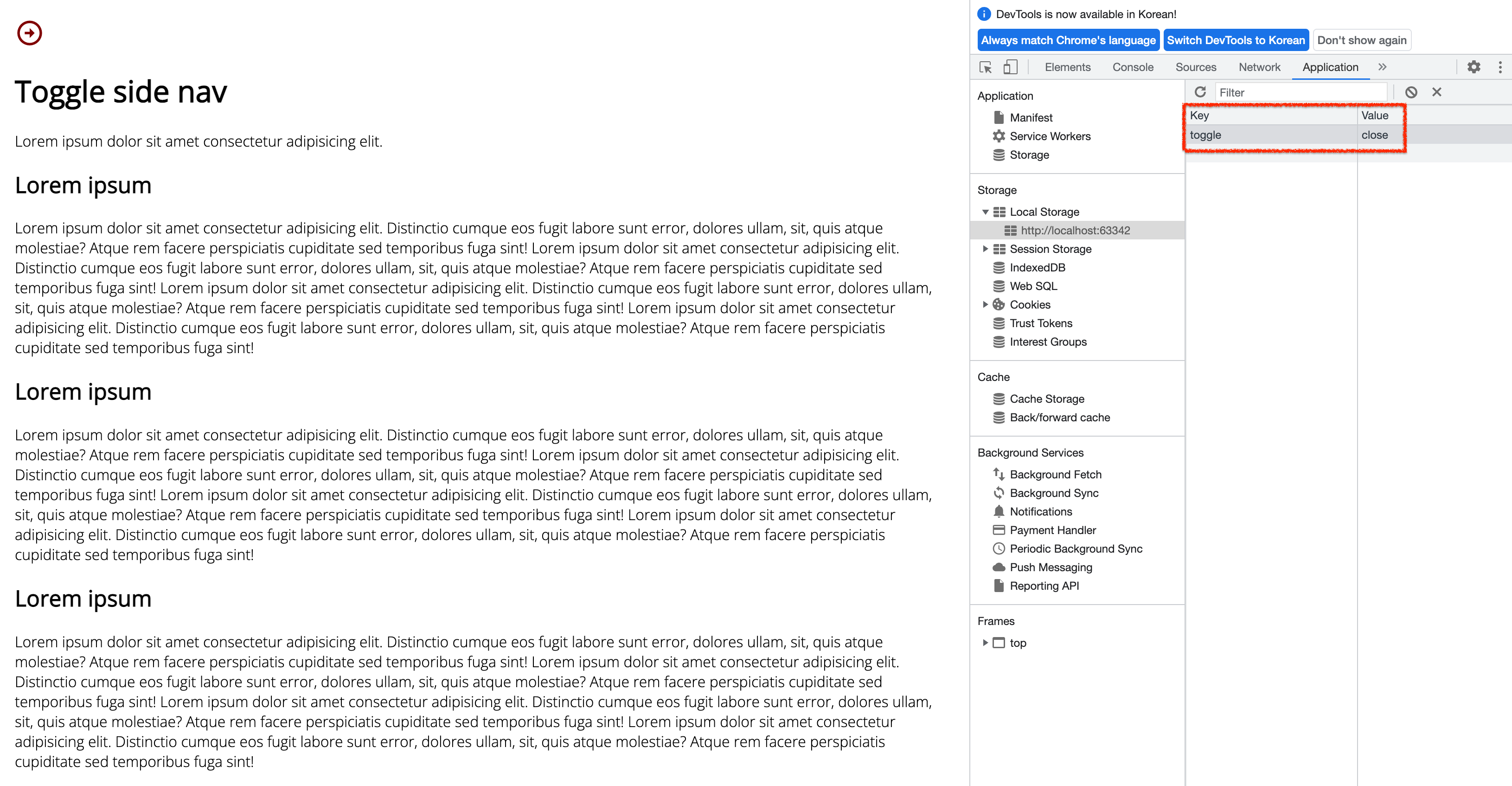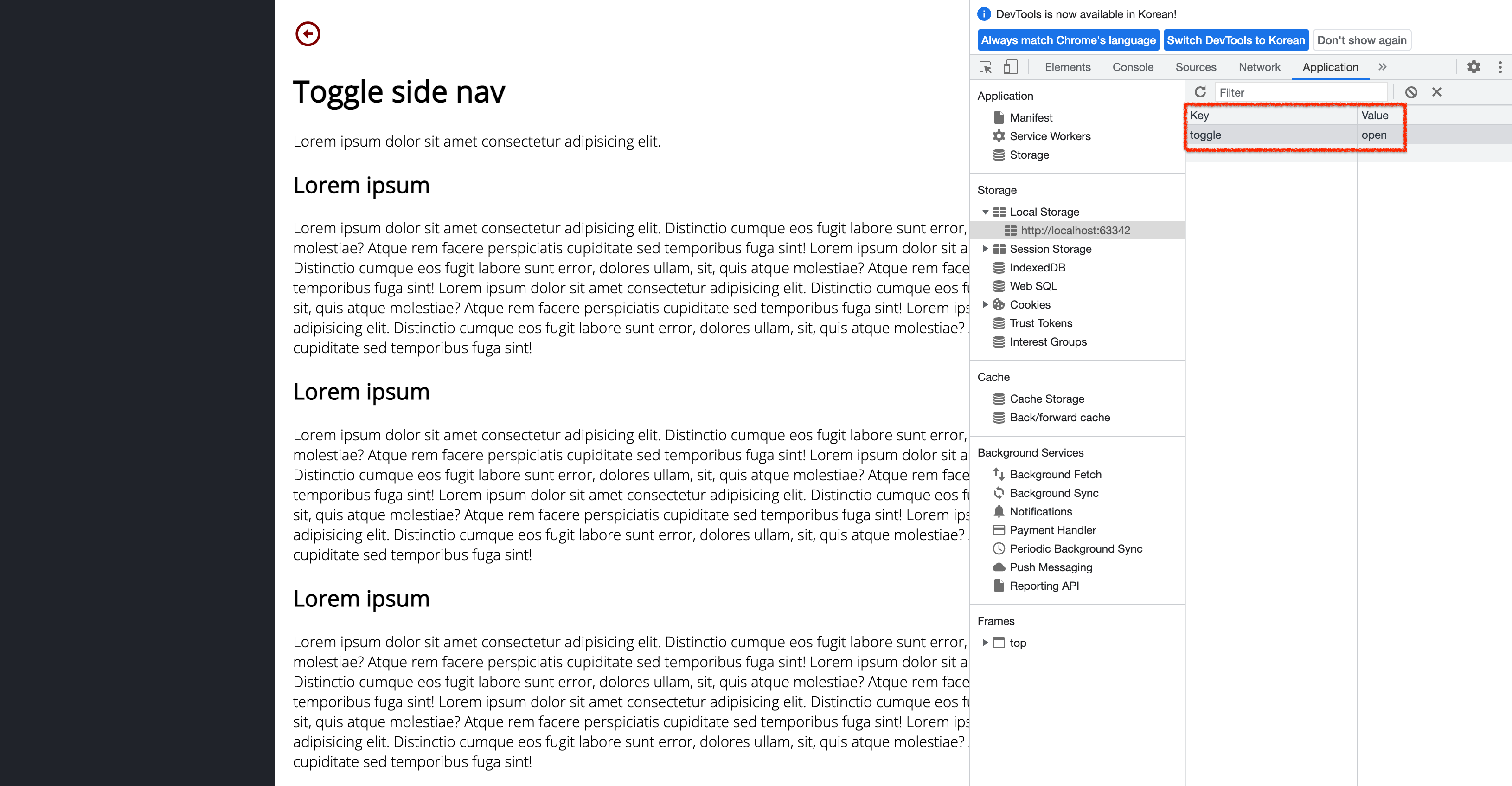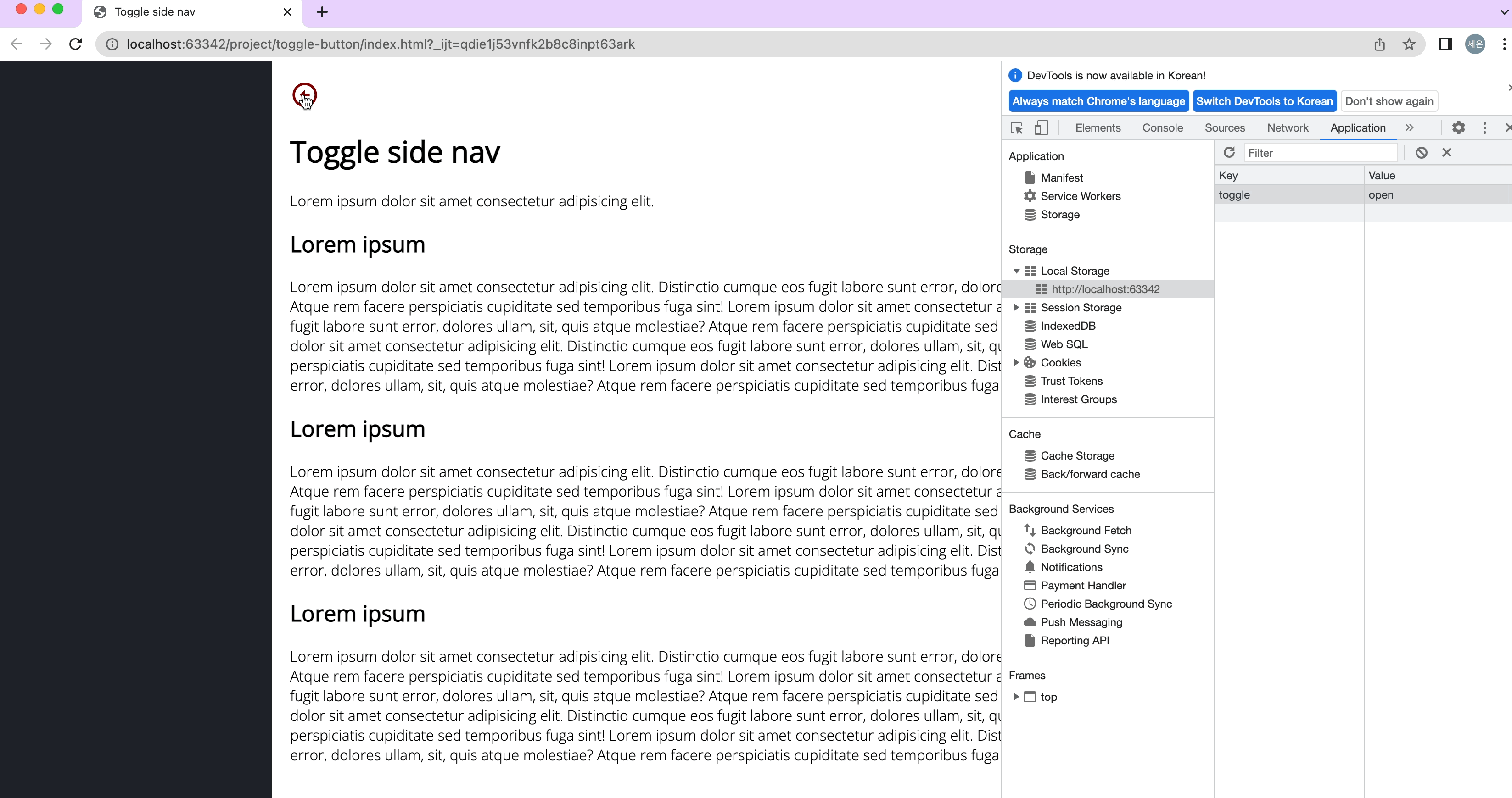 페이지가 새로고침 됐을 때에도 localstorage의 toggle이 open되어 있는 것을 볼 수 있다.