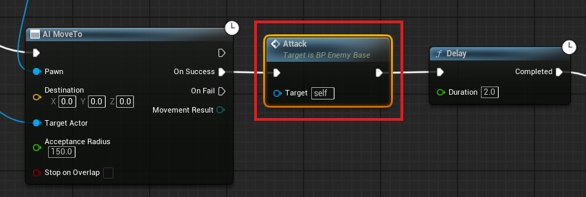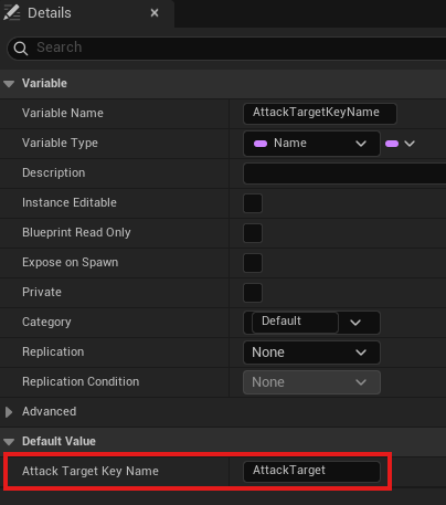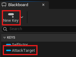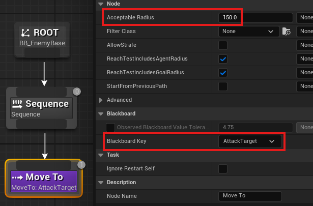 그리고 다시 Behavior Tree로 돌아와서 MoveTo 노드의 Blackboard Key를 방금 생성한 AttackTarget 액터로 설정하고, Radius도 블루프린트 노드와 똑같이 설정해줌