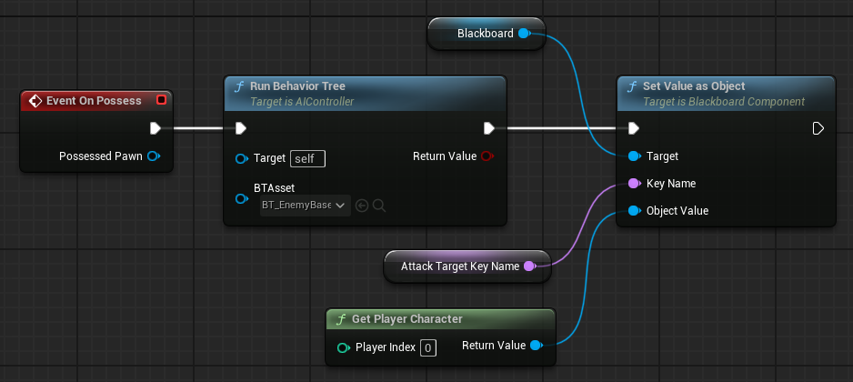 Run Behavior Tree 노드에서 우리가 생성한 BT_EnemyBase를 지정해주고, Set Value as Object 노드를 통해 Blackboard에 생성한 AttackTarget 변수를 지정해줘야 함