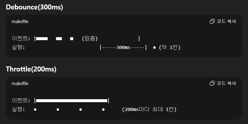 ➡️ Debounce = 멈추면 실행, Throttle = 간격마다 실행