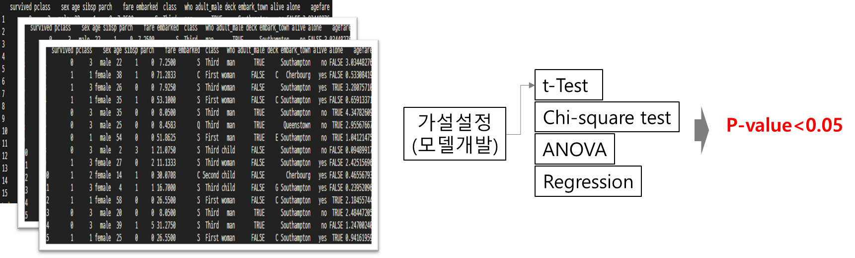표본 데이터를 사용하여 모집단에 대한 결론을 도출하는 통계적 기법으로 데이터 종류에 따른 가설검정 방법과 P(유의수준)값의 활용을 이해할 수 있다.