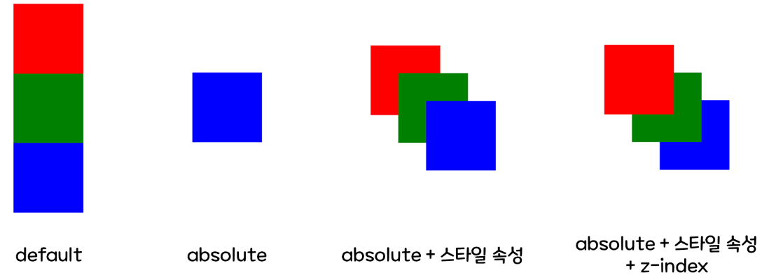 * absolute : 절대 위치 좌표* fixed : 화면 기준으로 절대 위치 좌표* relative : 초기 위치에서 상하좌우로 위치 이동* static : 위쪽에서 아래쪽 순서대로 배치 (default)우선 순위: position > z-index