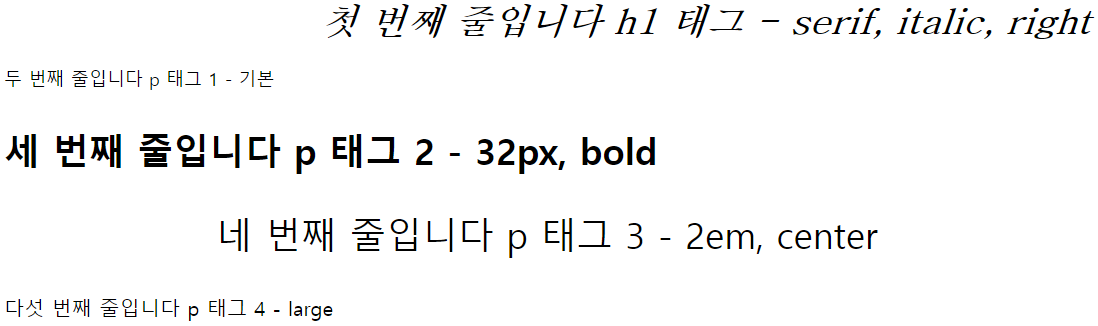 <h1 class="one">첫 번째 줄입니다 h1 태그 - serif, italic, right</h1>