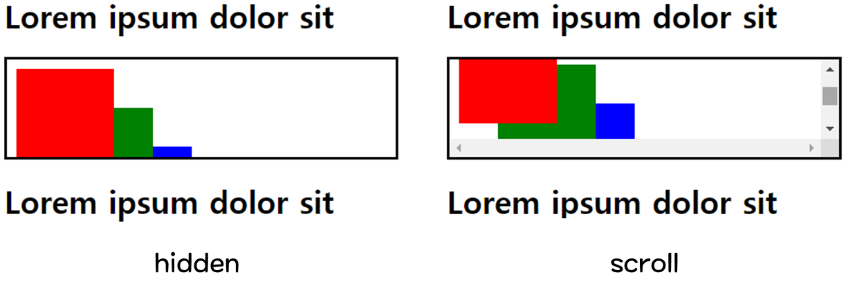 | scroll | 영역을 벗어나는 부분 스크롤로 만듦 |