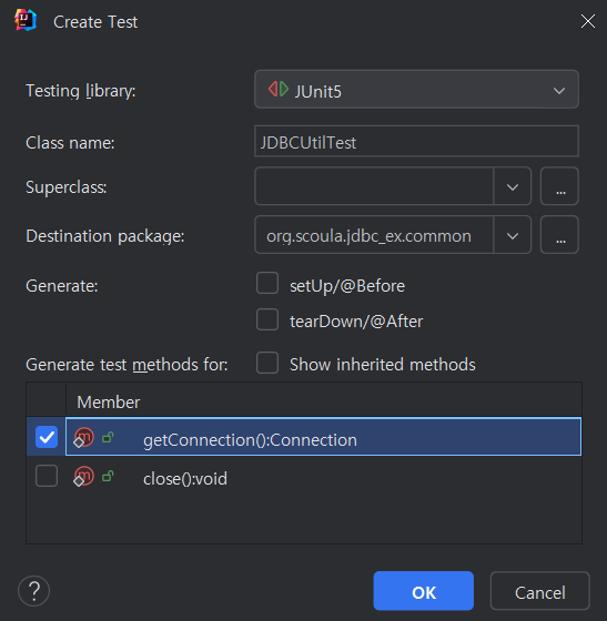 @DisplayName("jdbc_ex 데이터베이스 접속 (Connection Test)")