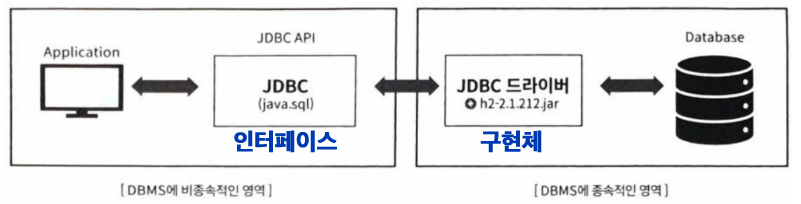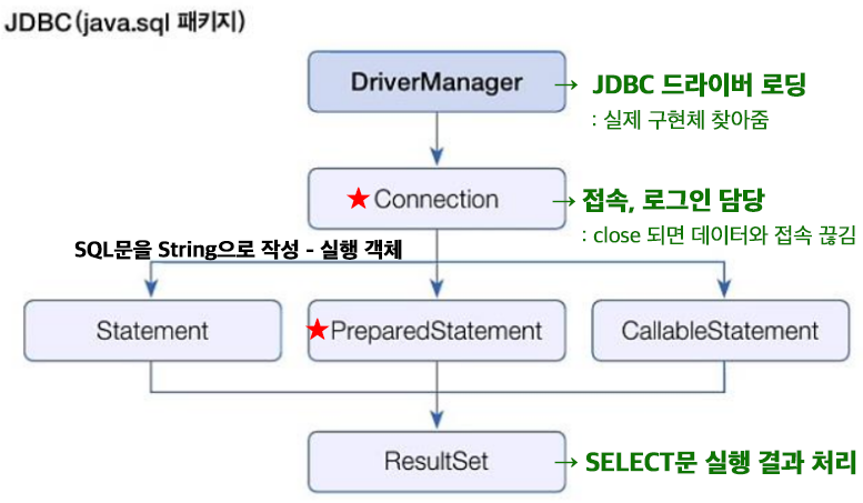 - DBMS의 종류와 상관없이 동일하게 사용할 수 있는 클래스와 인터페이스로 구성