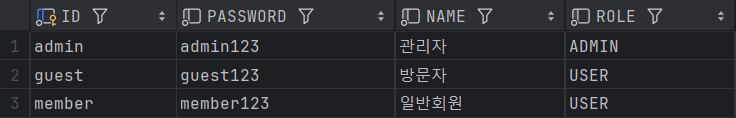 VALUES('guest', 'guest123', '방문자', 'USER'),