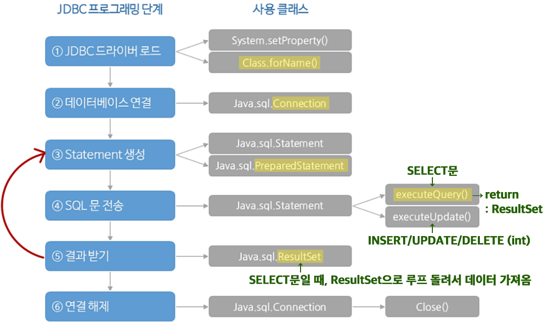 ResultSet executeQuery(SQL문) : SELECTint executeUpdate(SQL문) : INSERT, UPDATE, DELETEResultSet