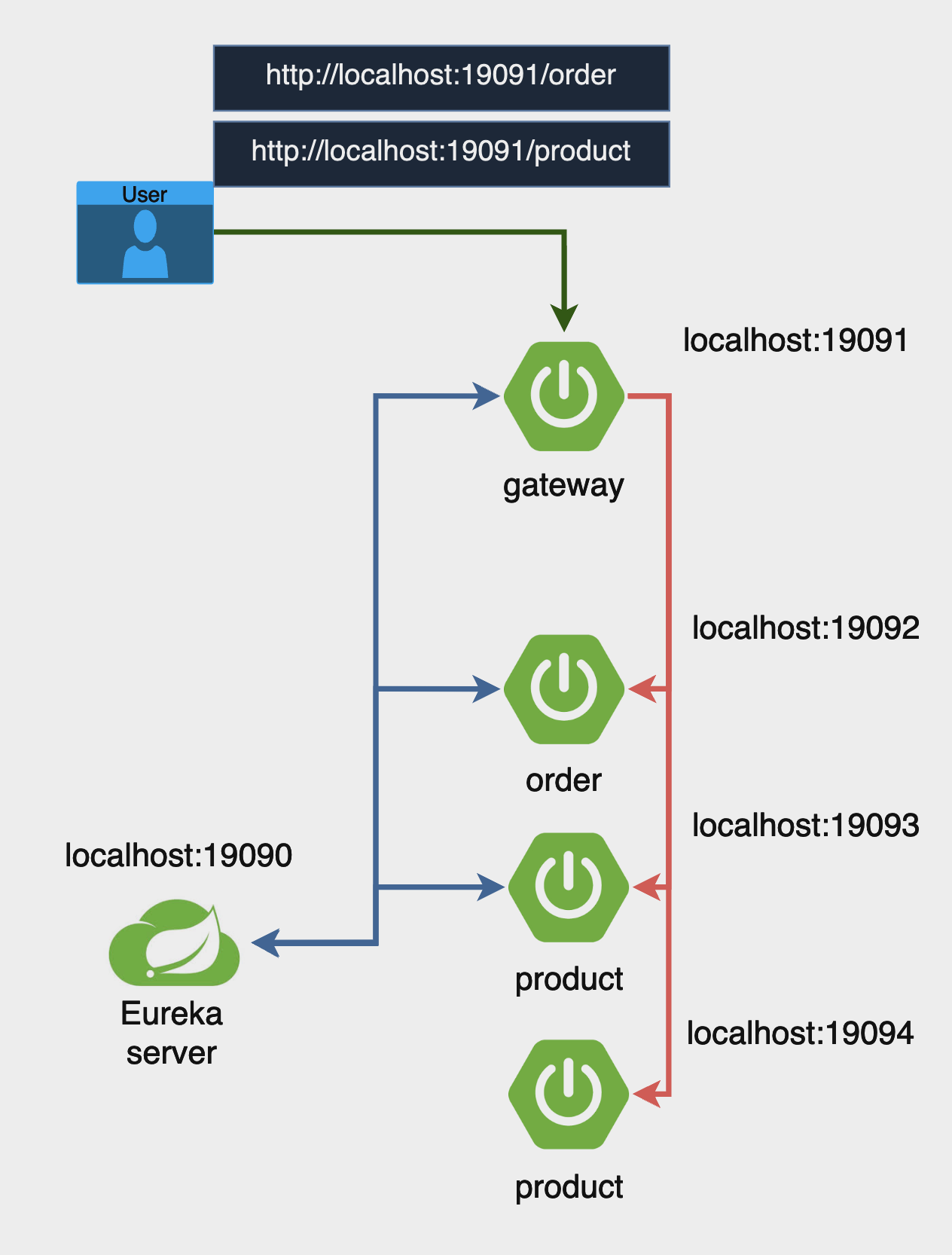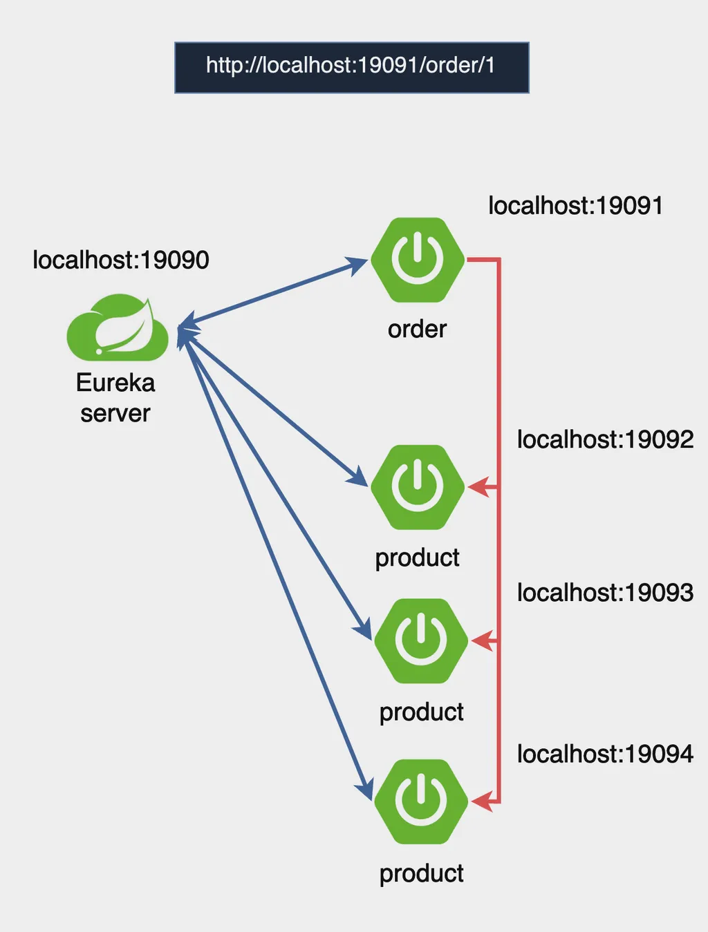 Eureka ServerEureka Discovery Client + Spring Web@EnableEurekaServerEureka-clientOpenFeign@EnableFeignClientsOrder 서비스가 Product 서비스 호출하여 상품 정보 가져옴