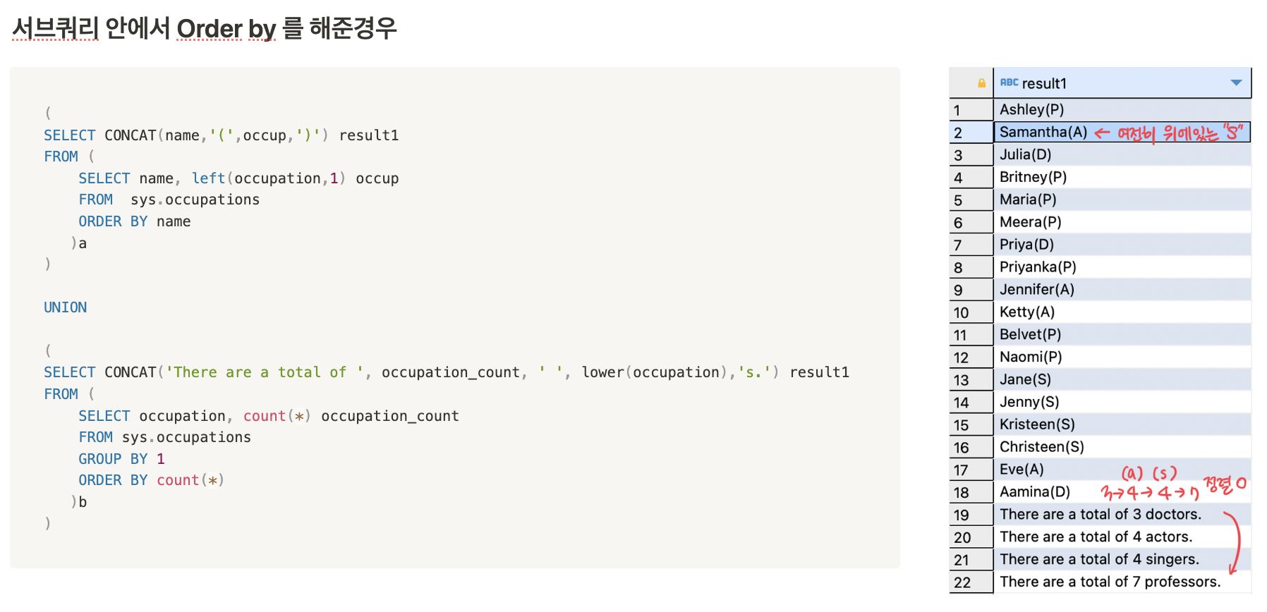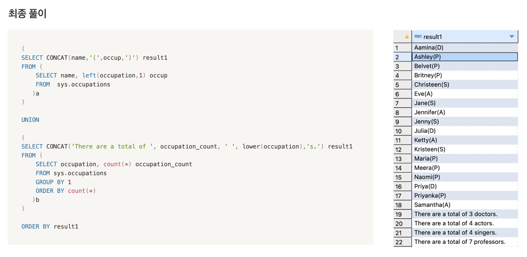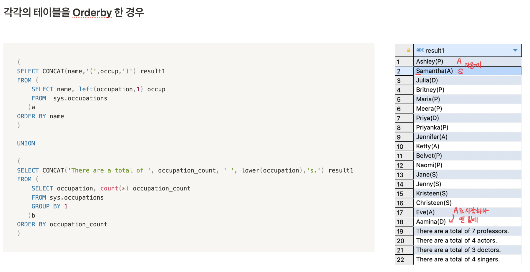 Hacker rank의 문제에 대한 풀이는 위의 코드로 끝이 났지만, result1컬럼을 기준으로 정렬한 것이기 때문에 There are a total of n occupations.라고 출력되는 컬럼이 맨 밑에 붙은게 아닐까 라는 궁금증이 생겼다. (S다음에는 T가 오니까..)