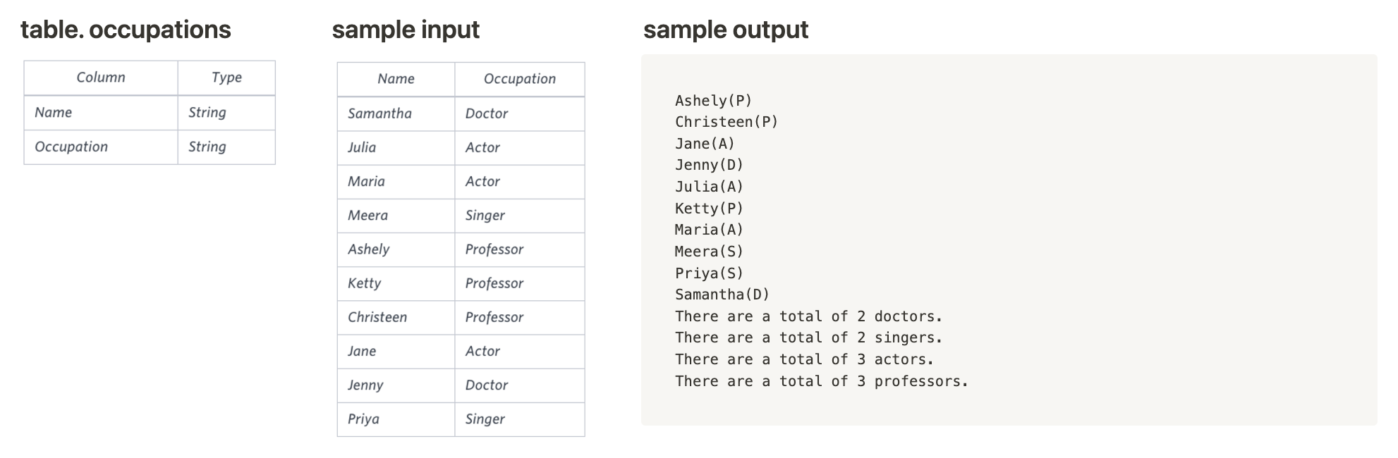 1. Occupations테이블에 있는 모든 이름을 알파벳순으로 나열하고, 직업의 첫글자를 그 뒤에 바로 나열는 쿼리를 작성하라. (예시 : AnActorName(A), ADoctorName(D), AProfessorName(P), and ASingerName(S).)