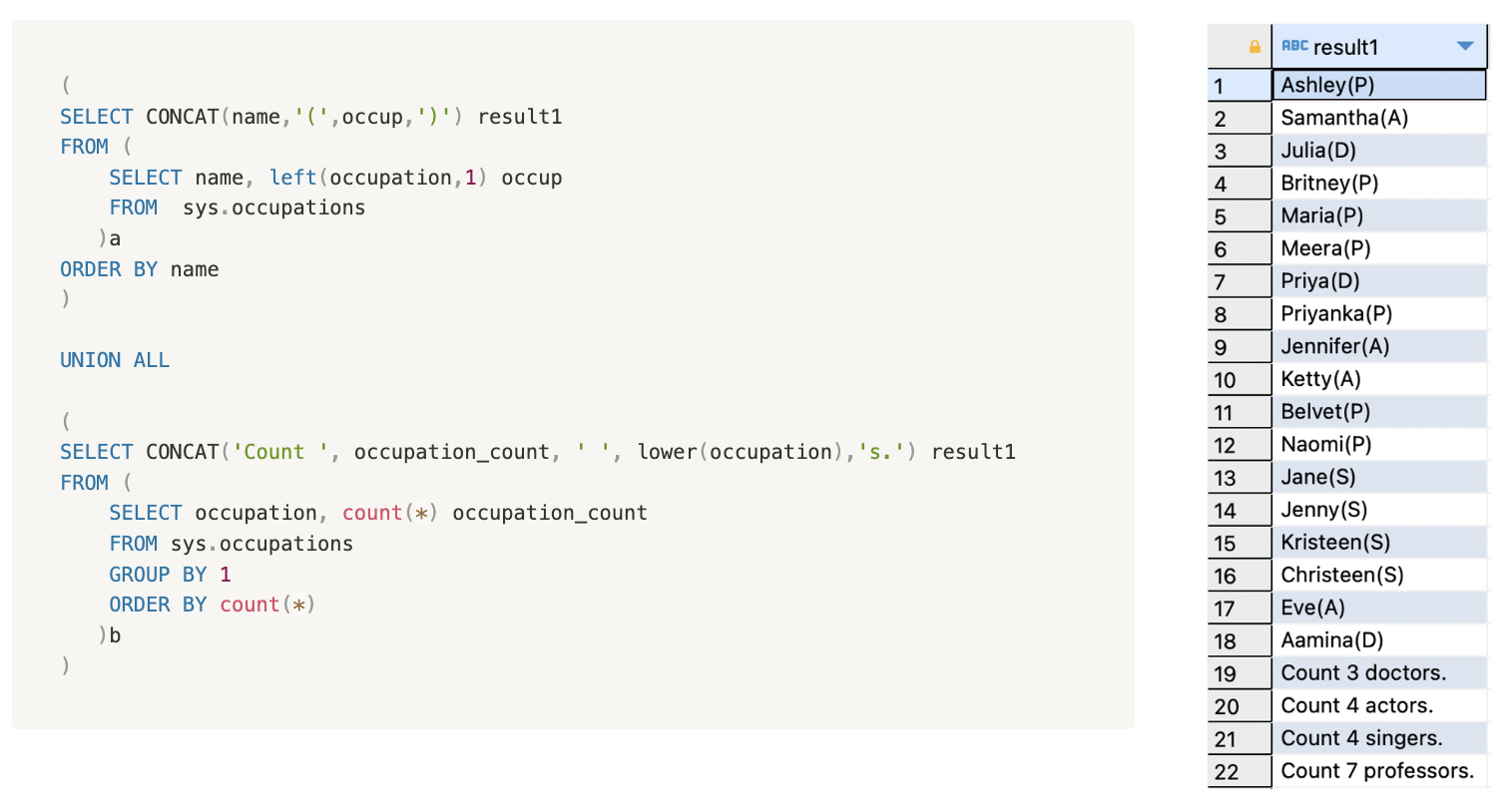 그래서 위와 같이 There are a total of n occupations.를 count n occupations로 바꾸어보았다. 위에서 볼 수 있듯, 정렬 기준이 result1이기 때문에 count로 시작하는 두번째 테이블의 출력값들이 6-9행에 위치해있는 것을 확인할 수 있다.