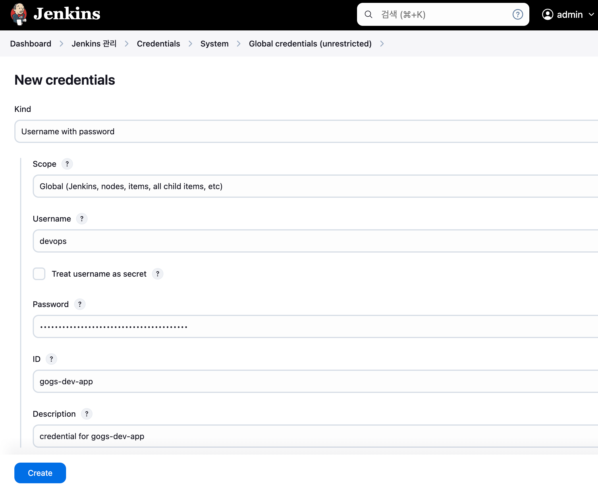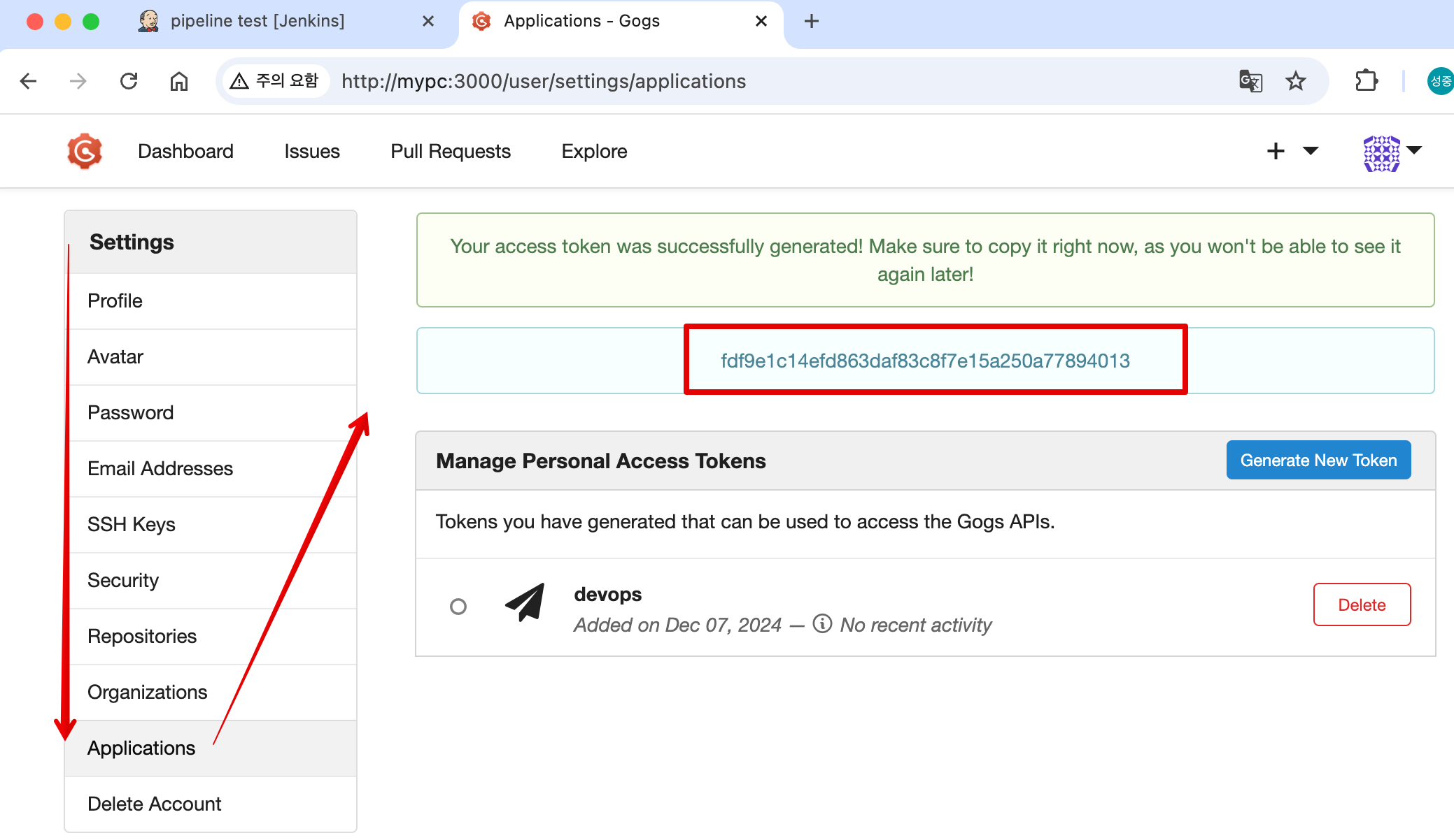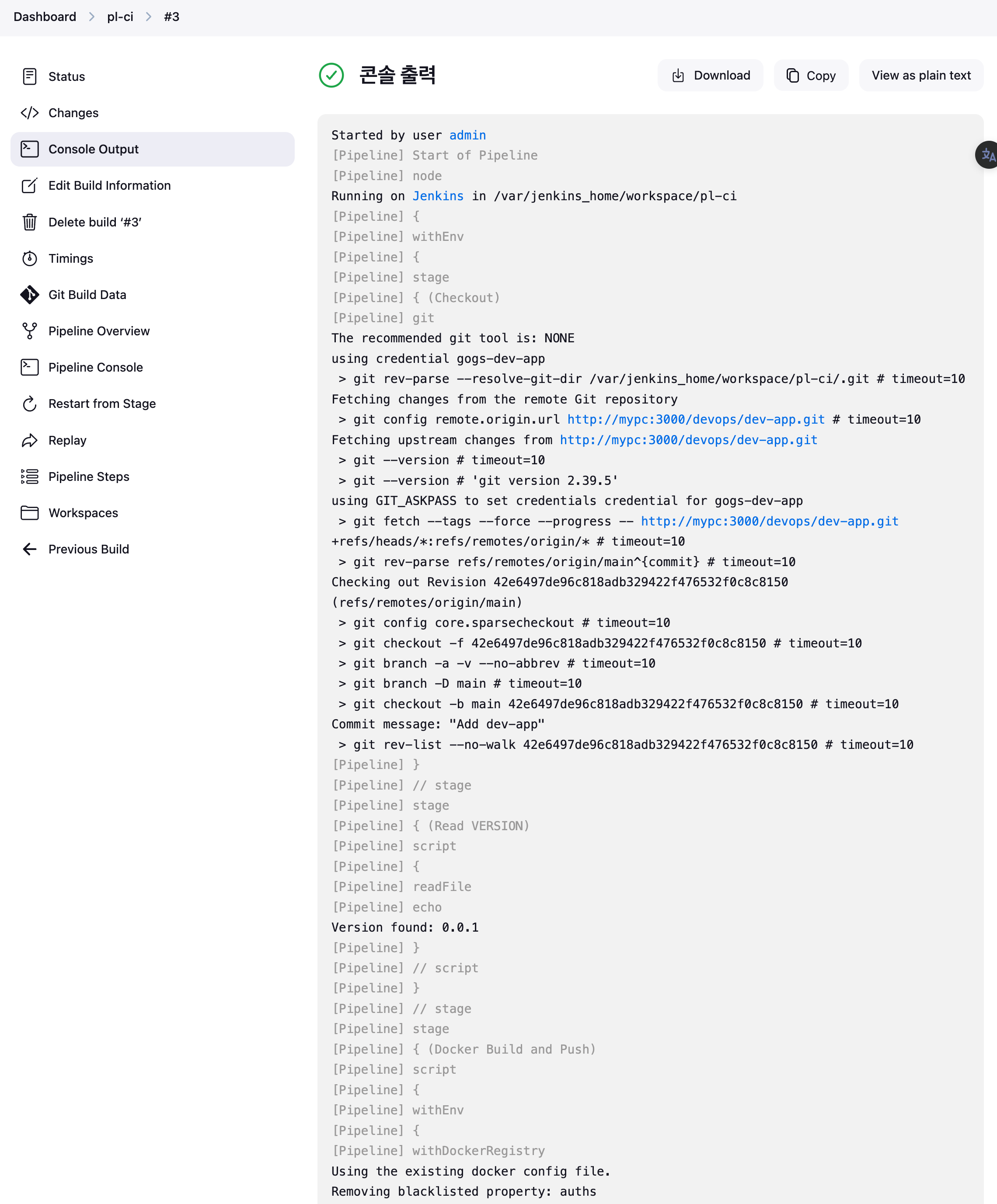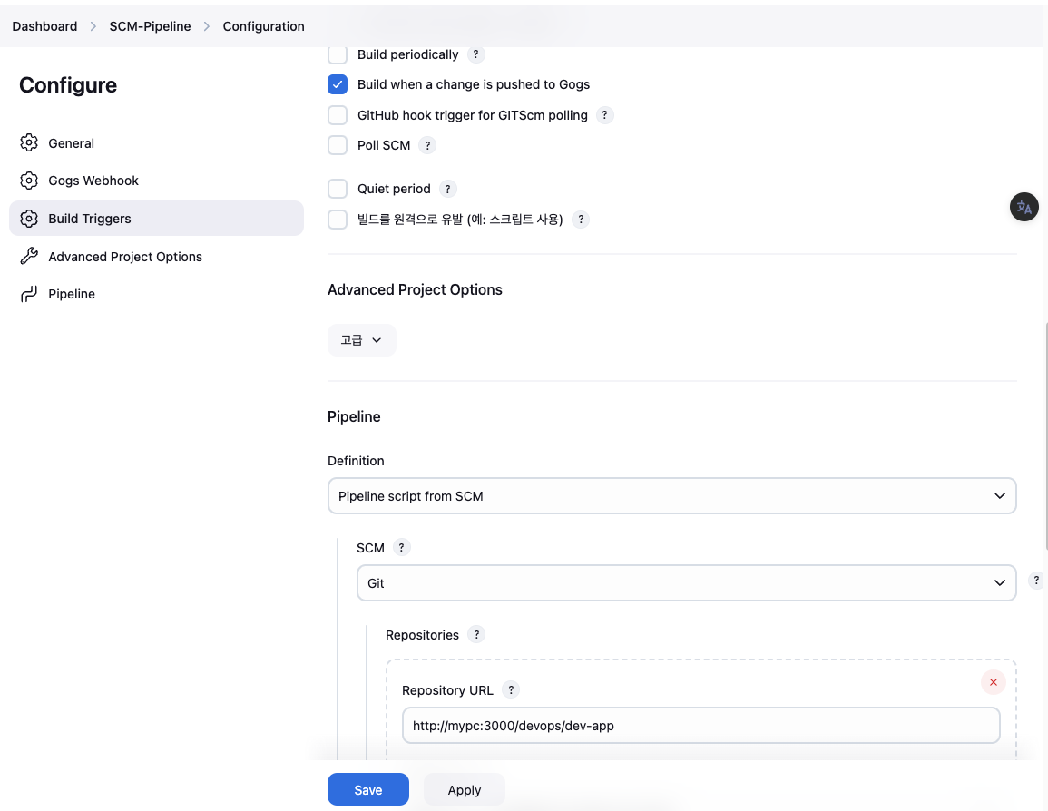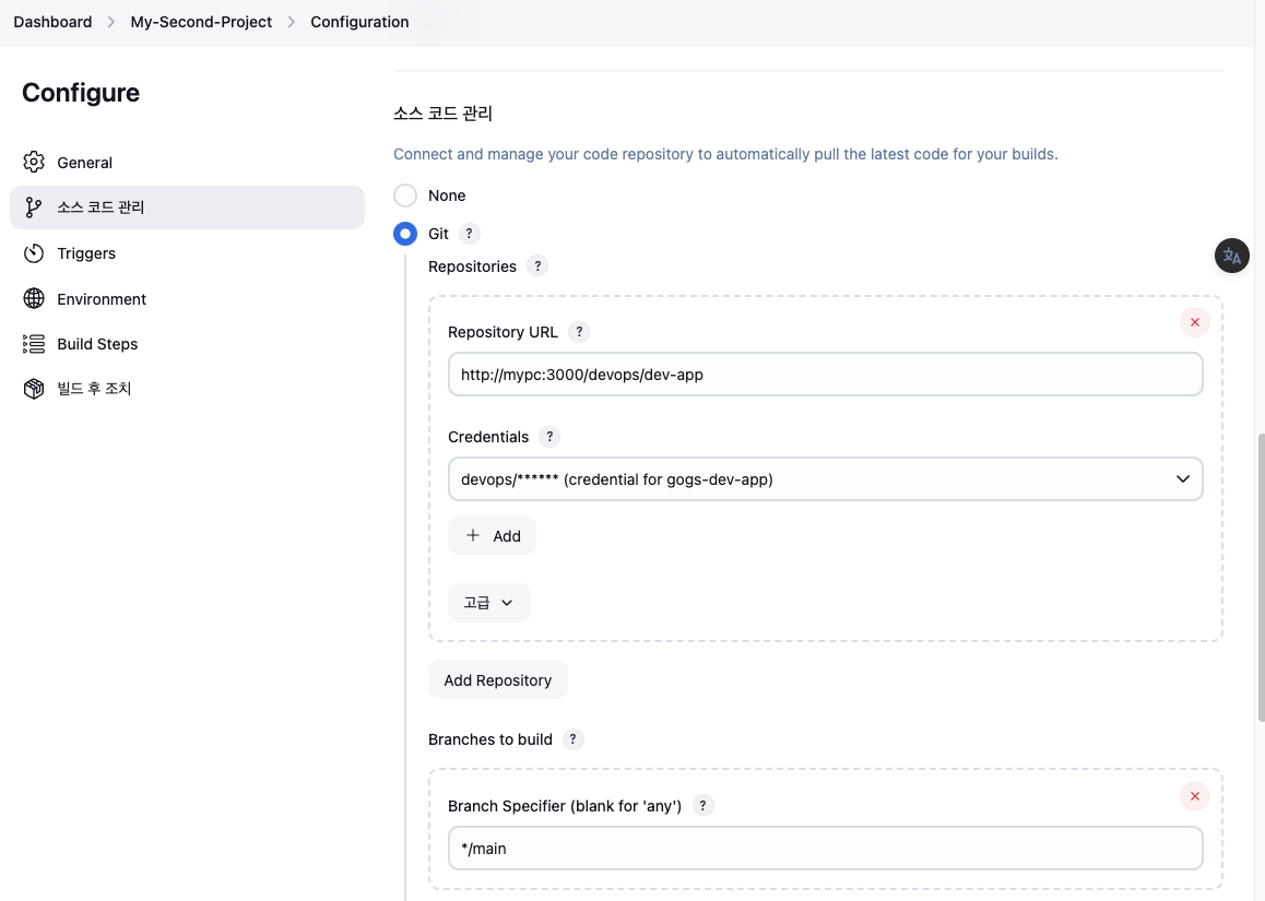 url: 'http://mypc:3000/devops/dev-app.git', // Git에서 코드 체크아웃