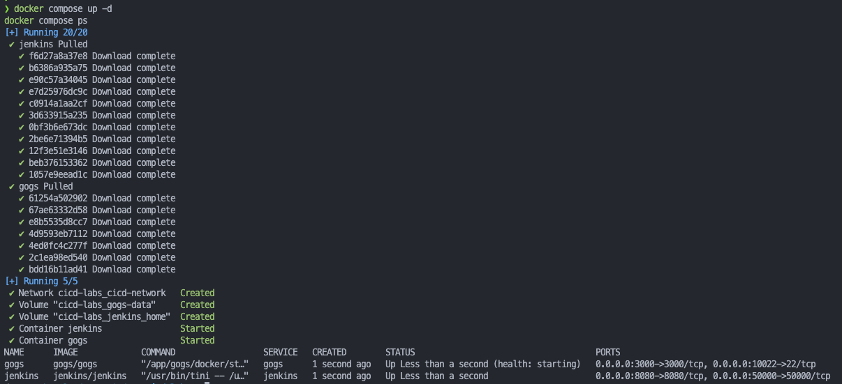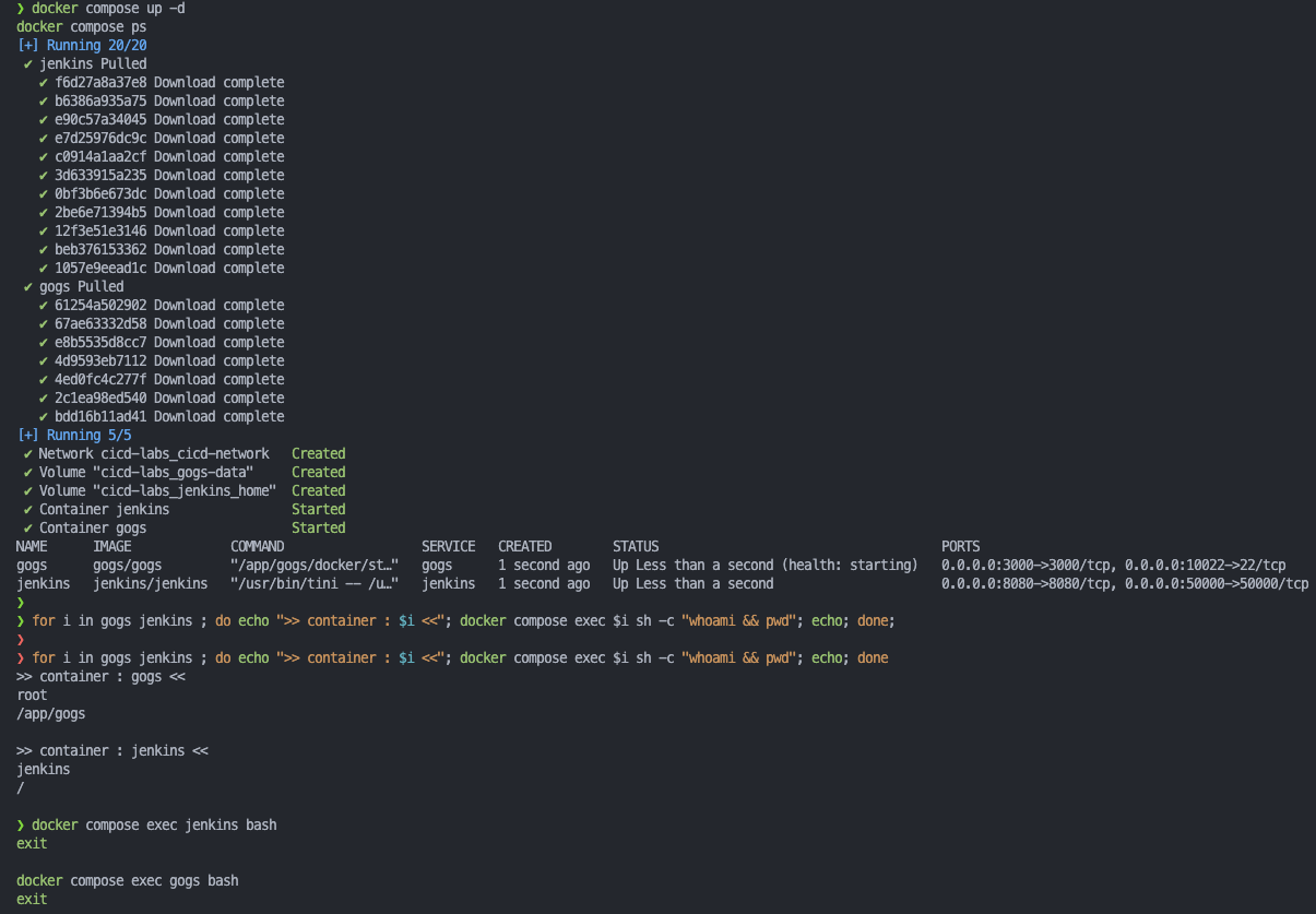 for i in gogs jenkins ; do echo ">> container : $i <<"; docker compose exec $i sh -c "whoami && pwd"; echo; done