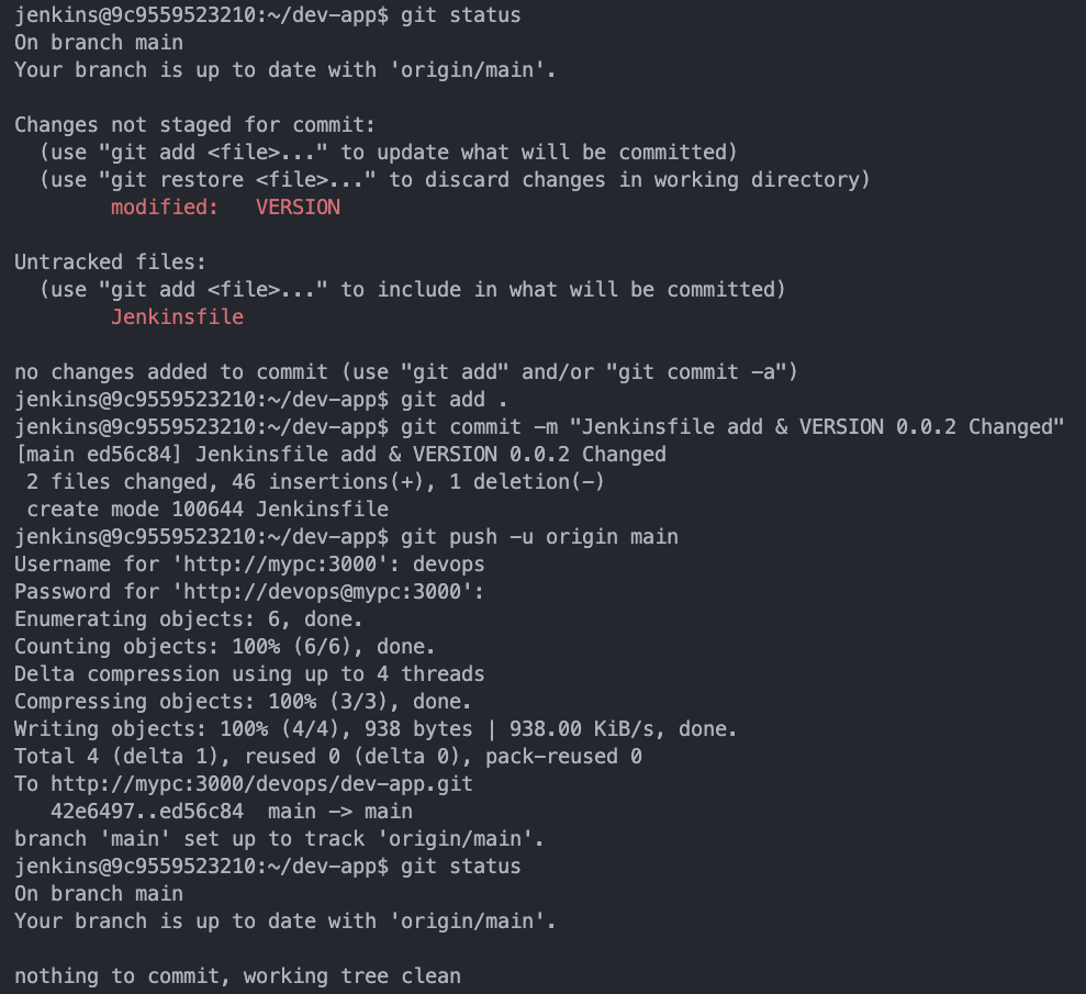 jenkins@5c1ba7016f9e:~/dev-app$ git add . && git commit -m "VERSION $(cat VERSION) Changed" && git push -u origin main