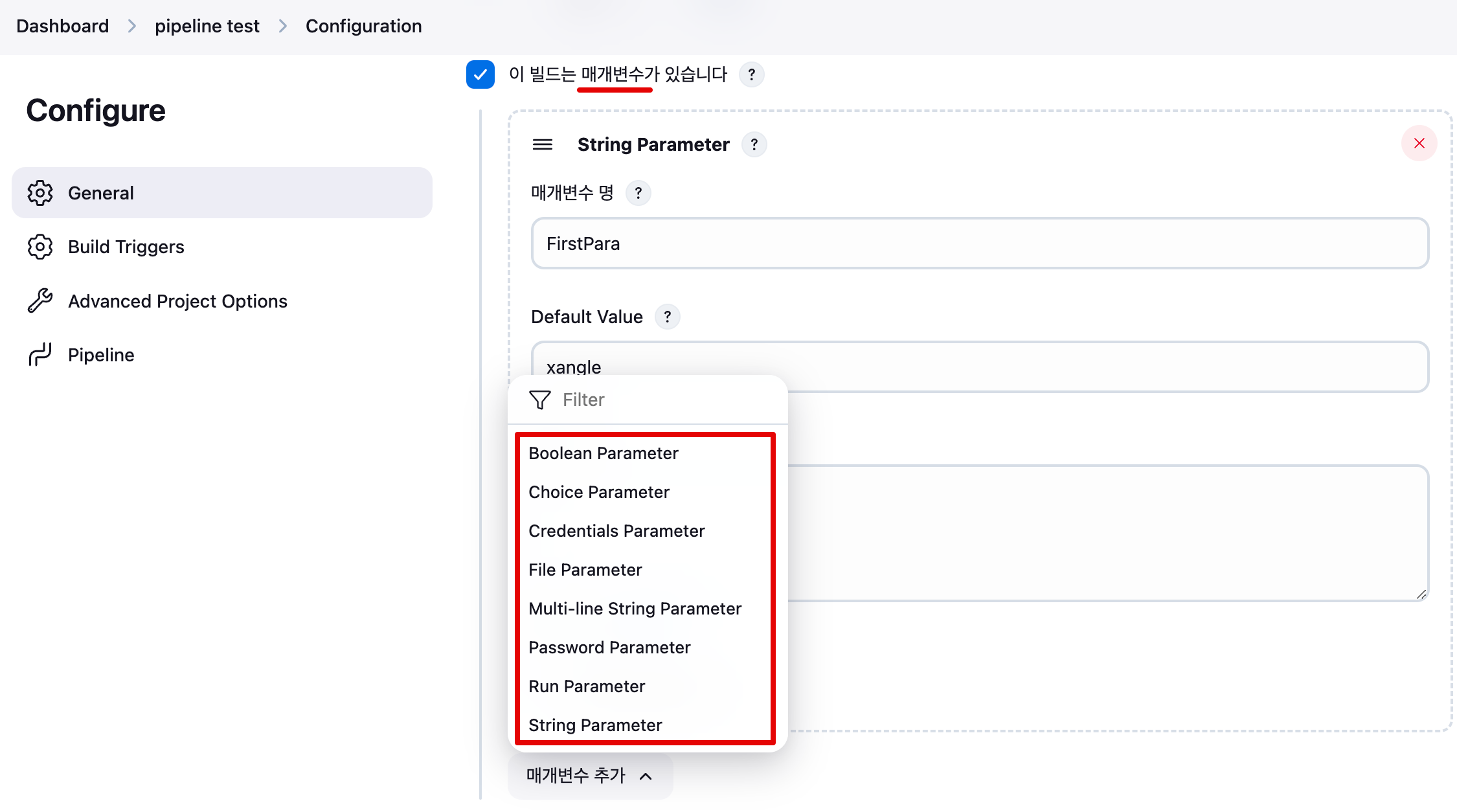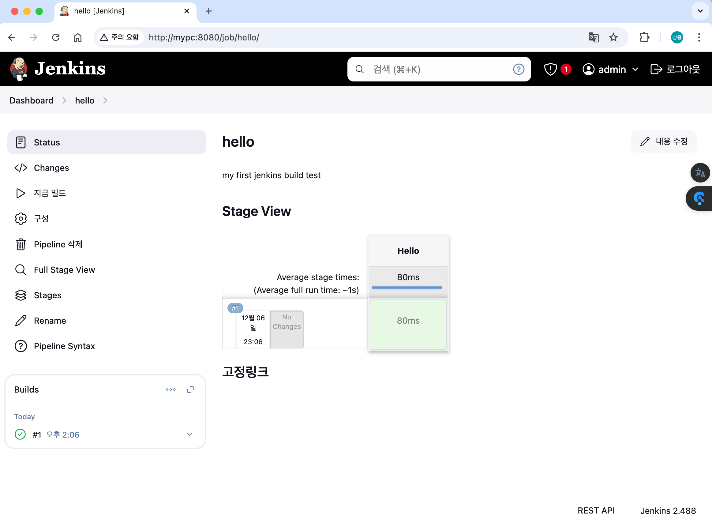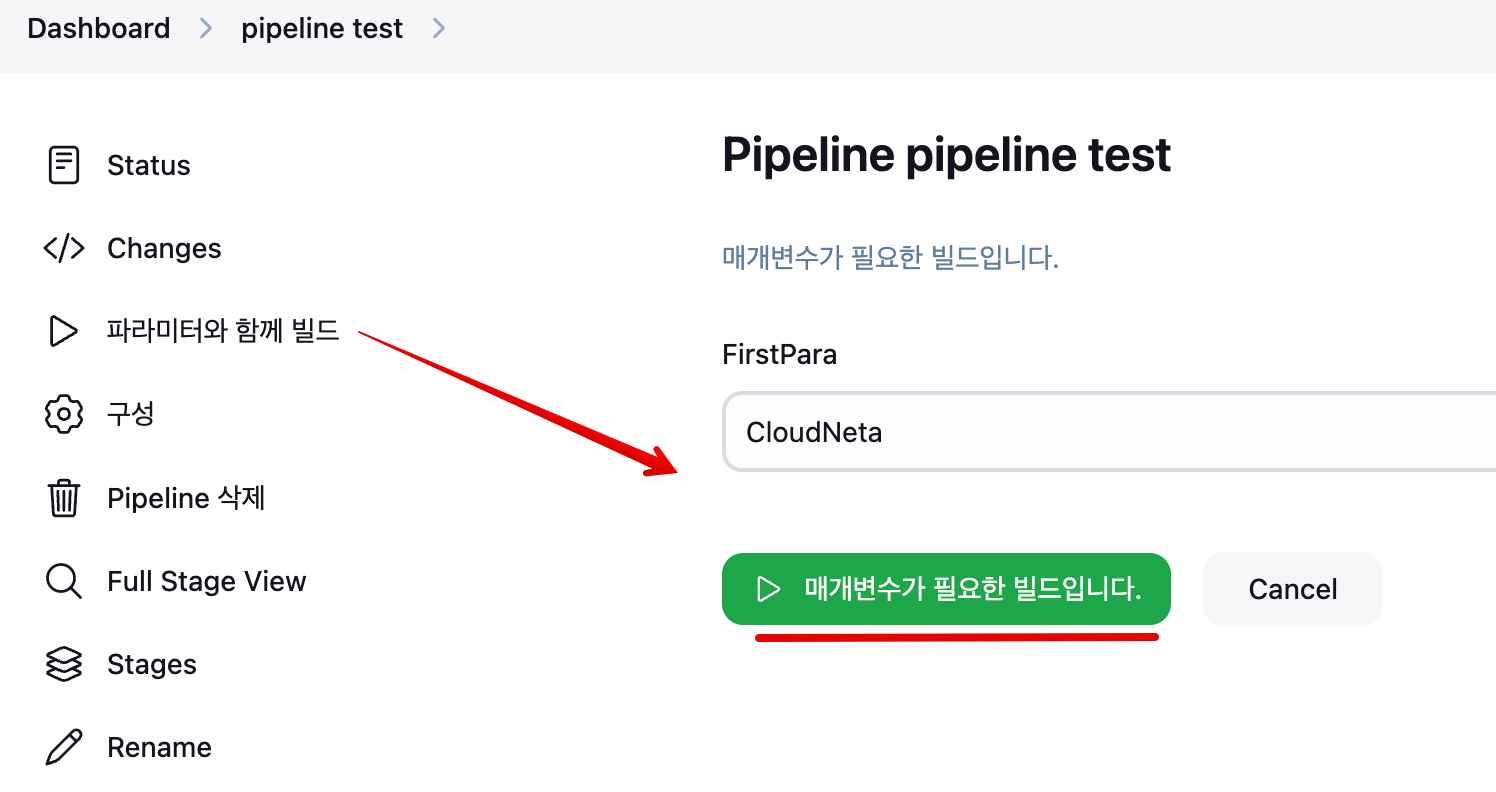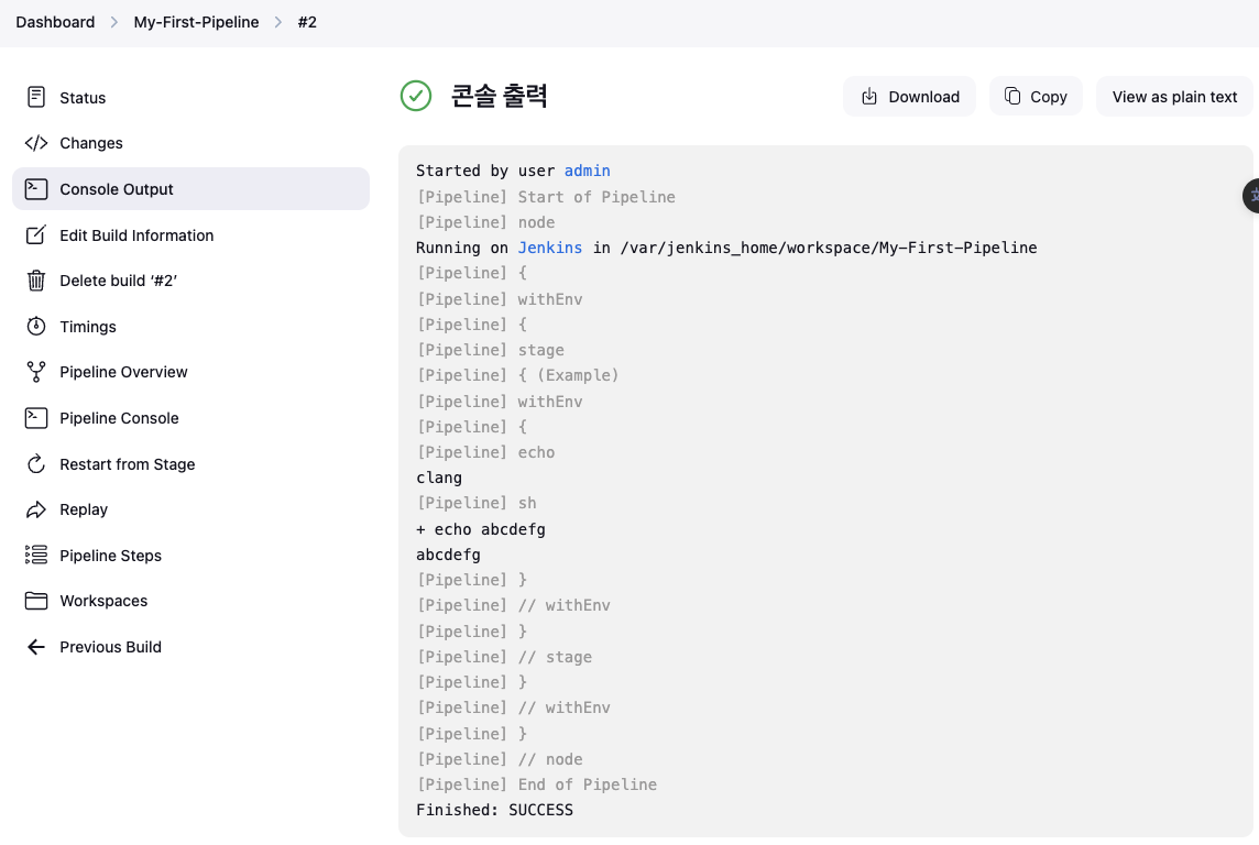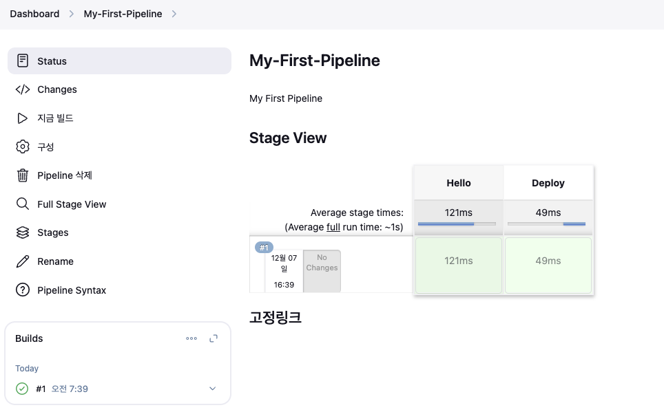 Item : My-First-Pipeline , Pipeline(Pipeline script - 아래 내용 추가 복붙) post 항목 : 빌드 성공 실패 등 메시지 출력
