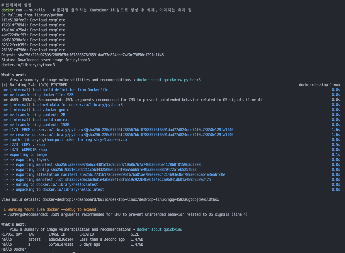 docker run --rm hello # 문자열 출력하는 Container 1회성으로 생성 후 삭제, 이미지는 유지 됨