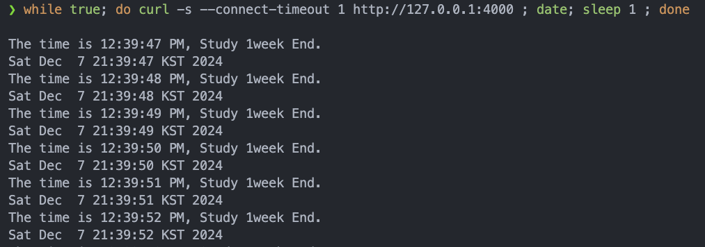 while true; do curl -s --connect-timeout 1 http://127.0.0.1:4000 ; date; sleep 1 ; done