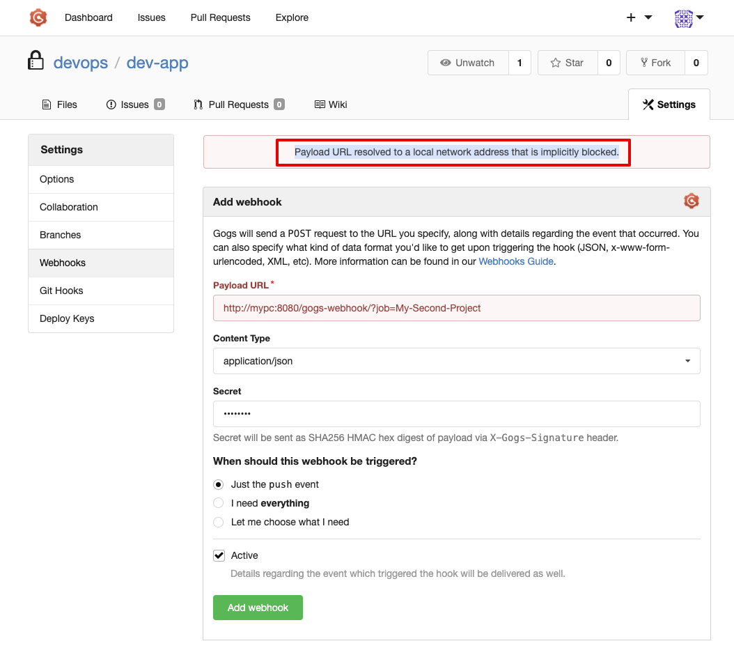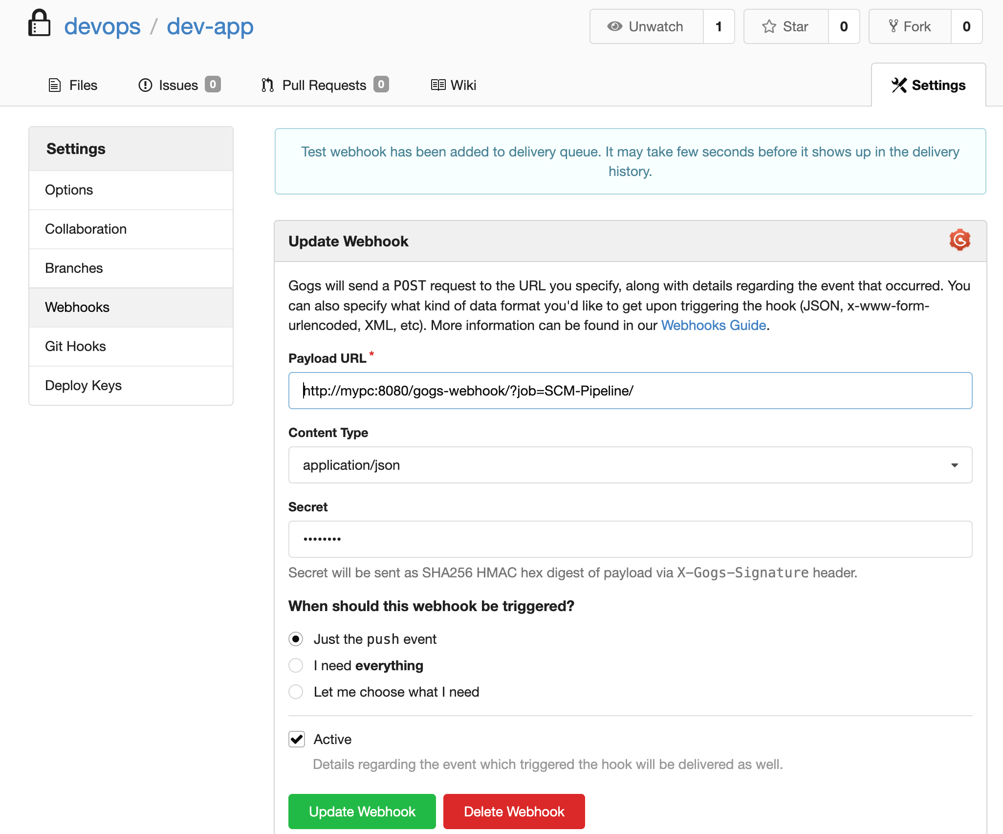 Payload URL : http://mypc:8080/gogs-webhook/?job=**SCM-Pipeline**/