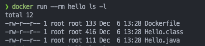 docker run --rm hello ls -l # Compile된 Hello.class 만 조회