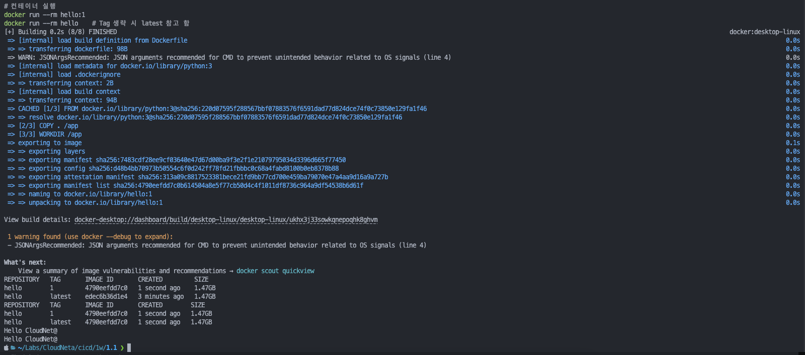 docker build . -t hello:1 # Tag로 1을 부여
