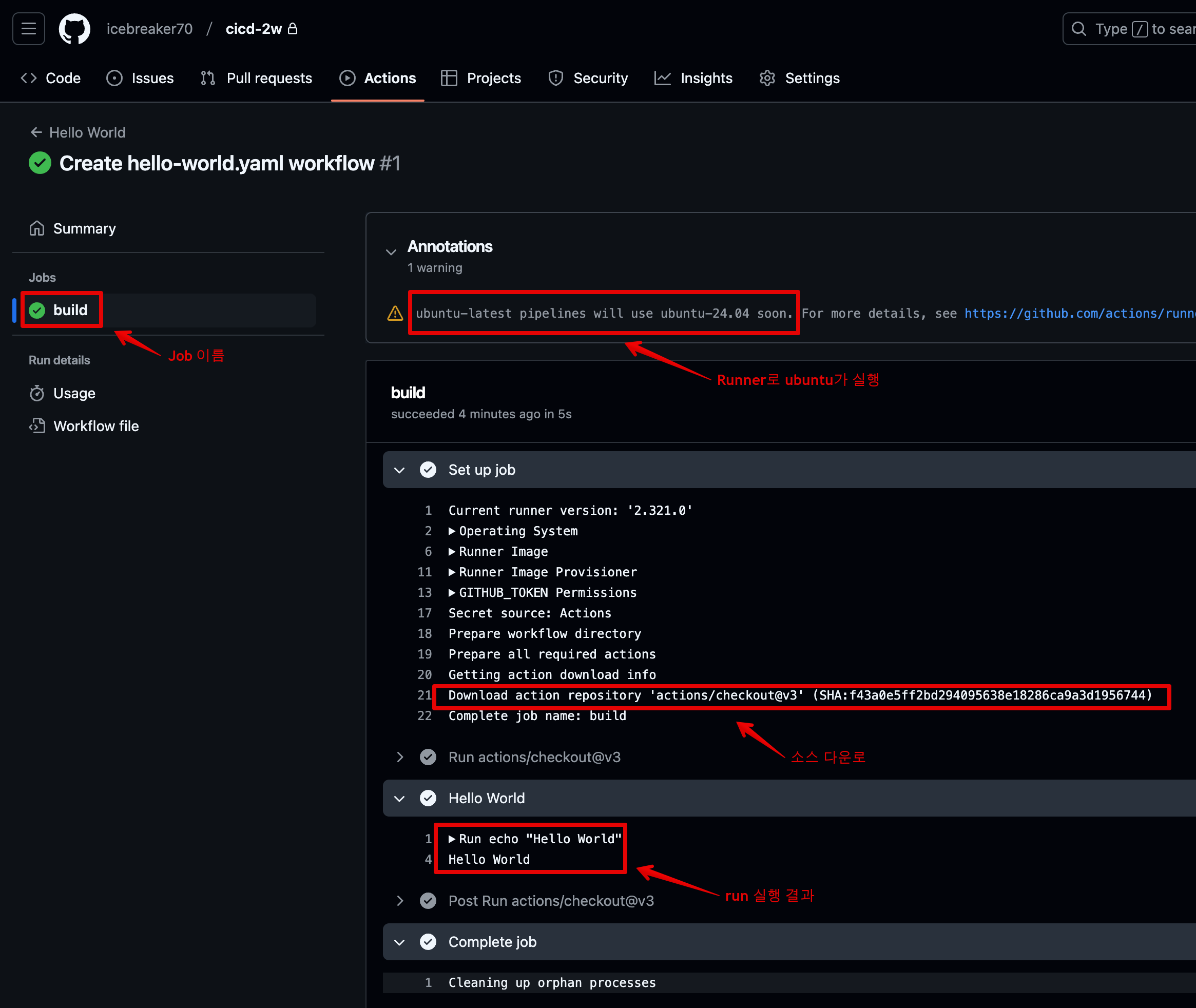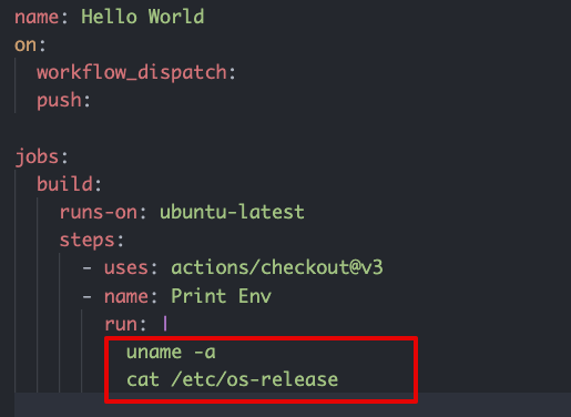 run: echo "Hello World" # 명령 실행, (예. echo “my text”, “python3 my_script.py)