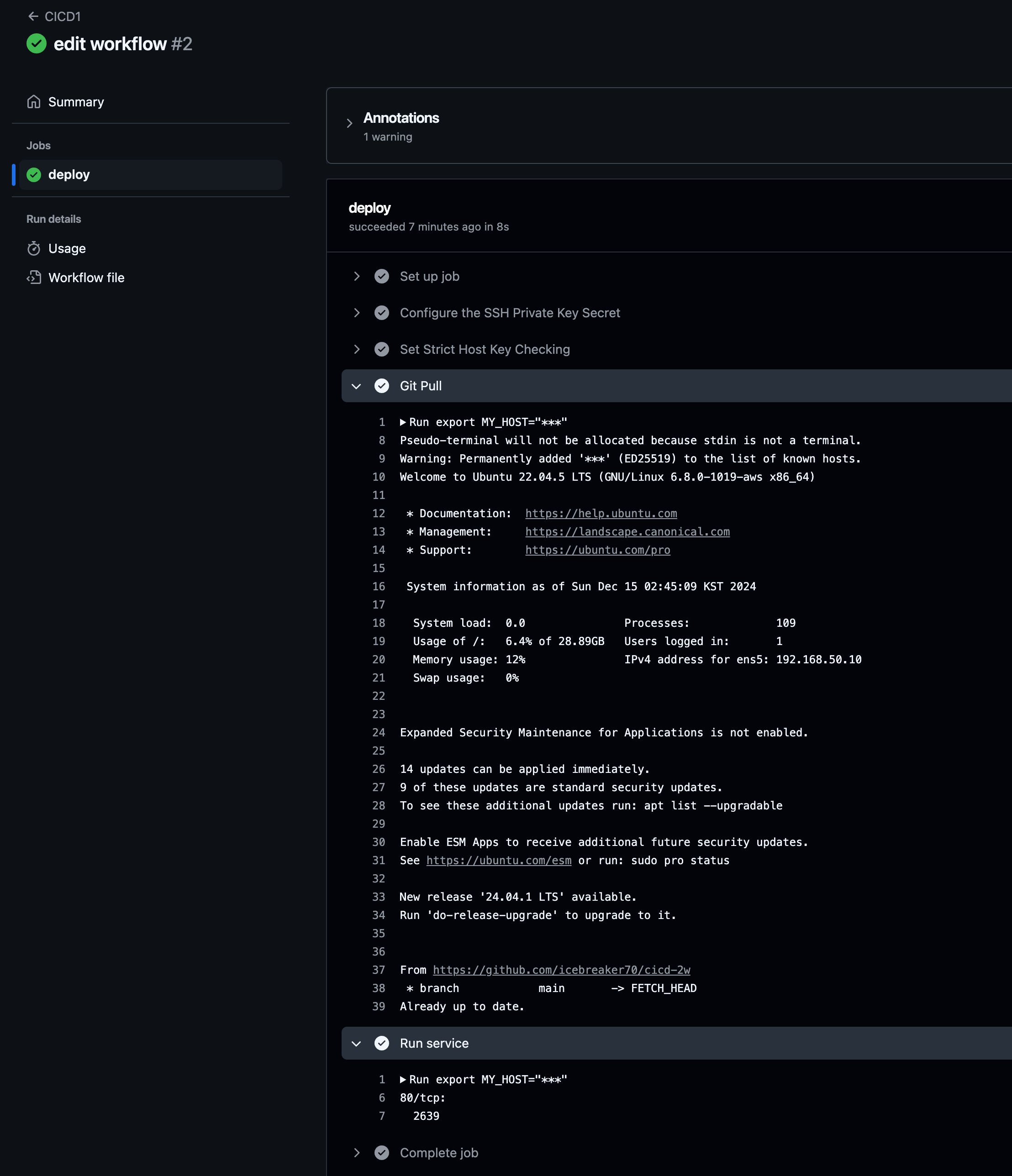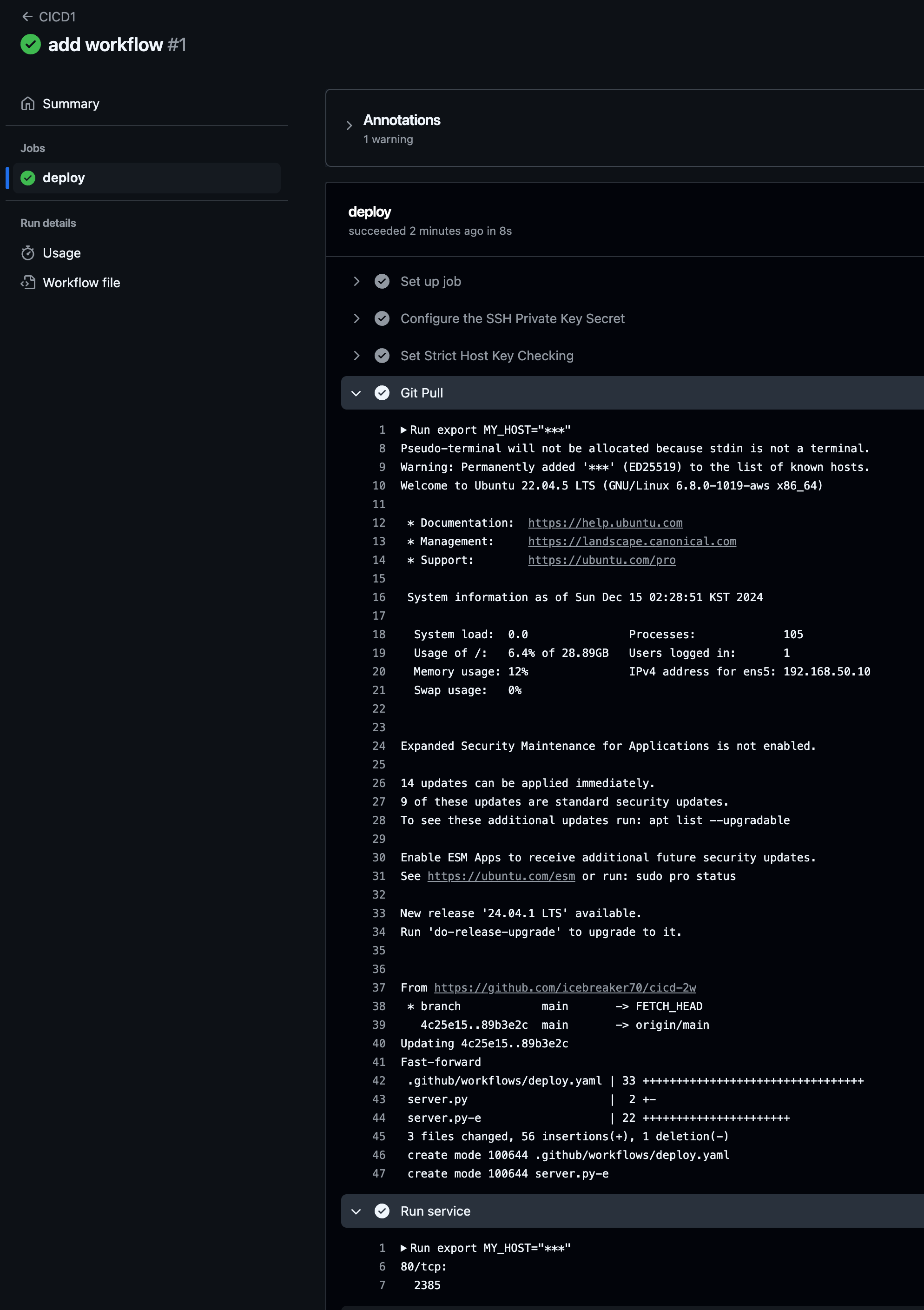 response_string = now.strftime("The time is %-I:%M:%S %p, SCP Test\n")최종 : github action 에서 코드 가져오고 변경된 py 파일을 전송 후 기존 서비스 중지 후 재기동