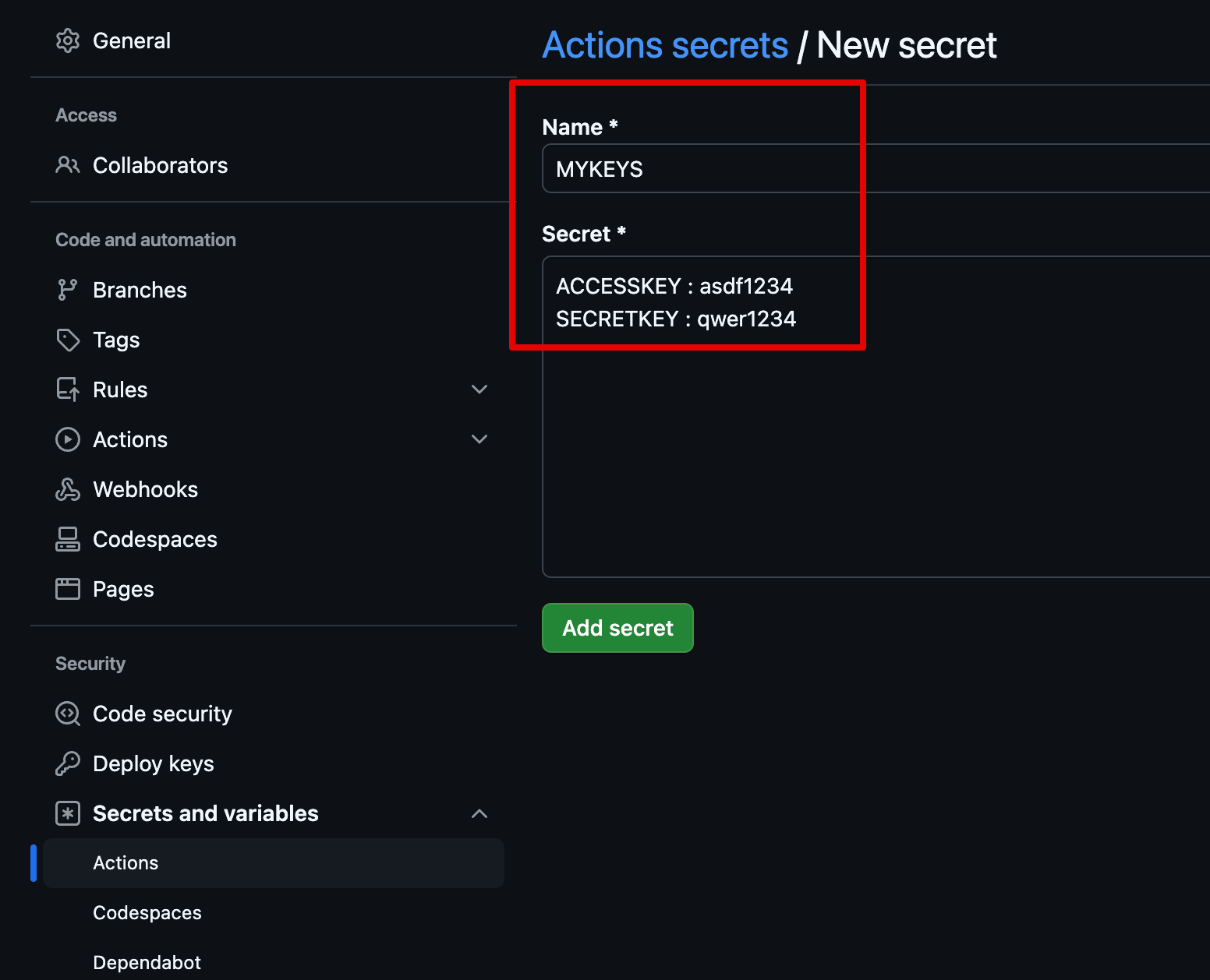 AWS_KEYS: ${{ secrets.MYKEYS }}
